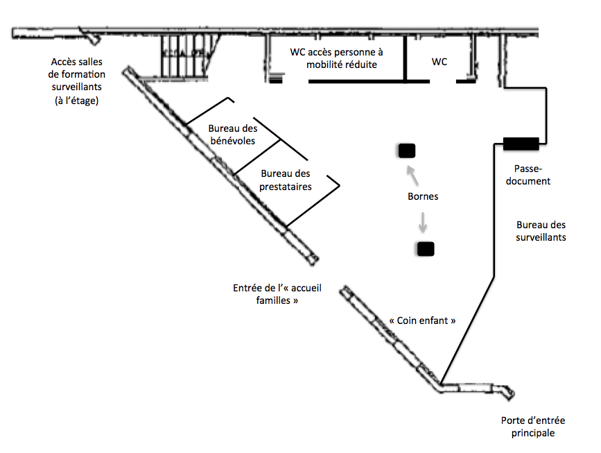 D’après les archives de l’association, nommée Aviso, celle-ci intervient dans le local d’attente réservé aux familles dès 1991. À cette date, seul le placard à balais est à la disposition des 14 bénévoles qui accueillent les familles les mercredis et samedis pour déposer leurs affaires. Quelques mois plus tard, des travaux, entrepris afin de permettre aux surveillants en charge du contrôle du portique de sécurité d’avoir un accès à la lumière du jour, ont pour conséquence de réduire l’espace d’accueil. En outre, le surveillant de l’accueil rejoint ses collègues du portique : il déménage dans un bureau vitré à mi-hauteur, et devient invisible grâce à des films sans tain posés sur les vitres. L’interaction avec les surveillants depuis l’accueil n’est désormais possible qu’à travers un passe-document. Malgré la demande des bénévoles, la direction de l’établissement ne veut pas agrandir le local et compenser la perte d’espace d’accueil, pour des raisons de sécurité [10]. Un compromis est finalement trouvé et des travaux, financés par l’association, commencent. Il s’agit de rendre cet espace plus chaleureux : un carrelage est posé sur le béton brut, les bancs sont déboulonnés du sol. Progressivement, les bénévoles aménagent un coin destiné aux enfants avec des jouets et un tableau noir, décorent l’intérieur du lieu par l’accrochage de tableaux colorés rapportés d’un voyage par l’une d’entre eux. Mais ils s’approprient réellement le lieu lorsqu’ils en modifient plus nettement encore l’architecture intérieure, en faisant construire un bureau vitré en son centre. Cet espace, appelé par les accueillants « la bulle », est dédié à des échanges plus confidentiels avec les proches qui le désireraient. Les bénévoles entendent ainsi offrir une écoute bienveillante et personnalisée.