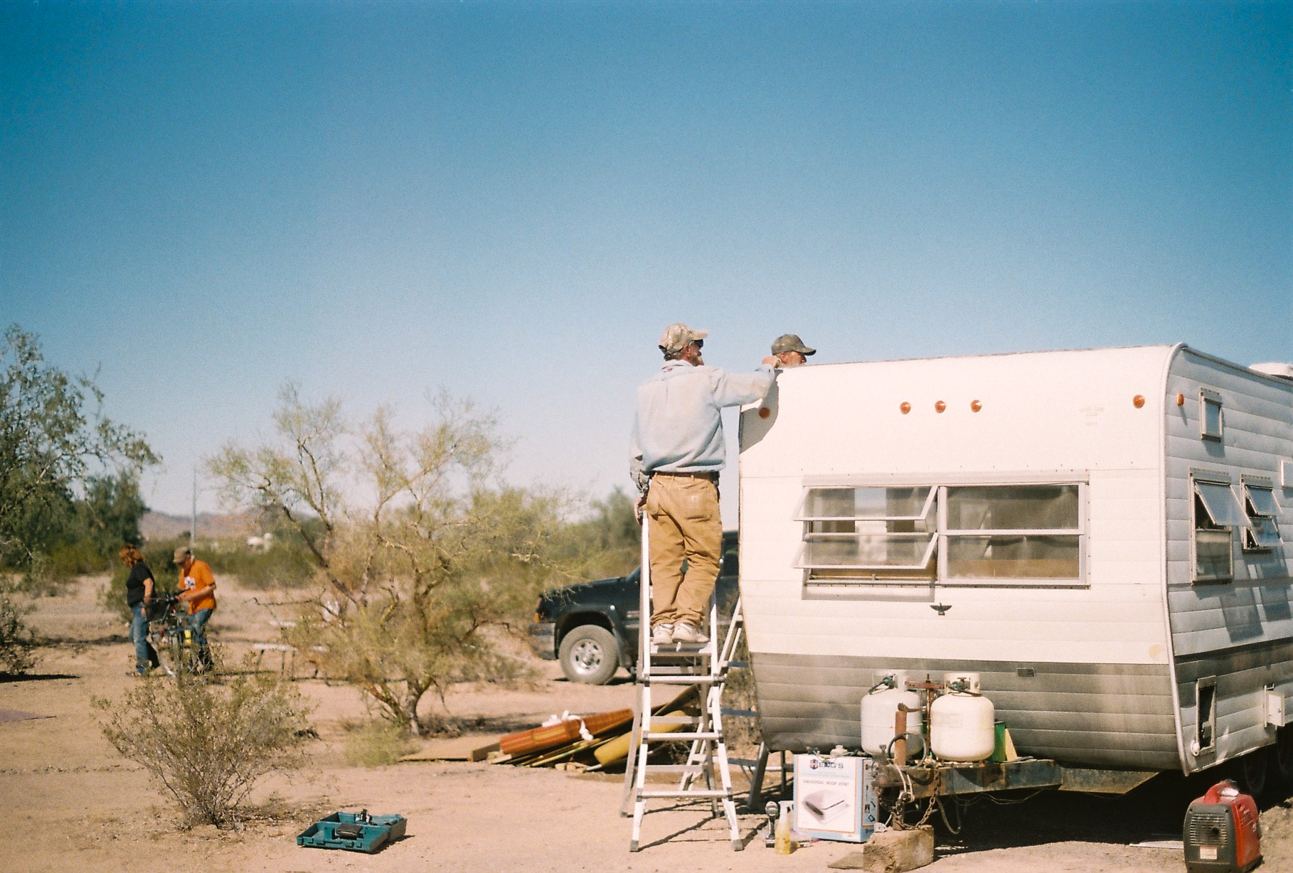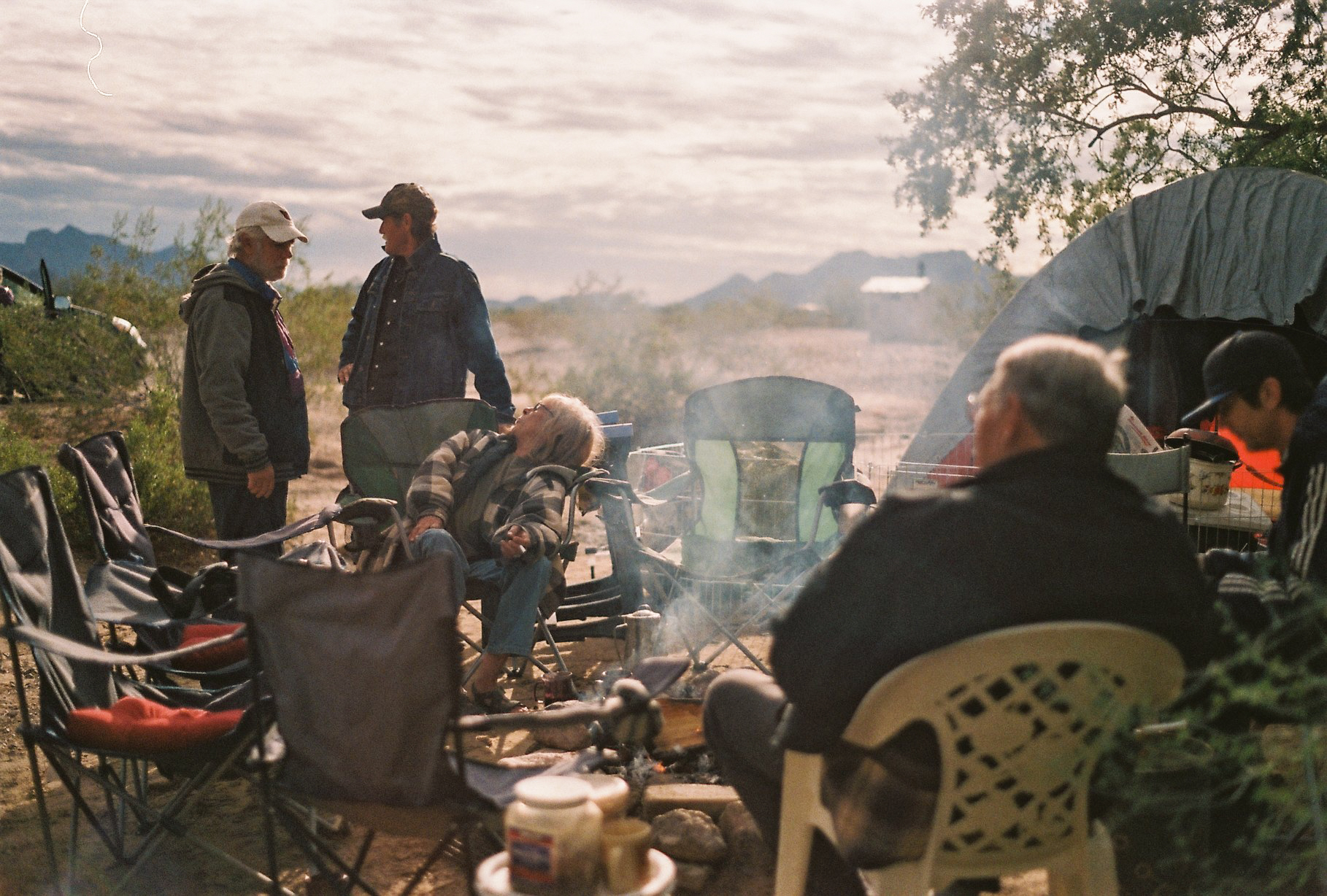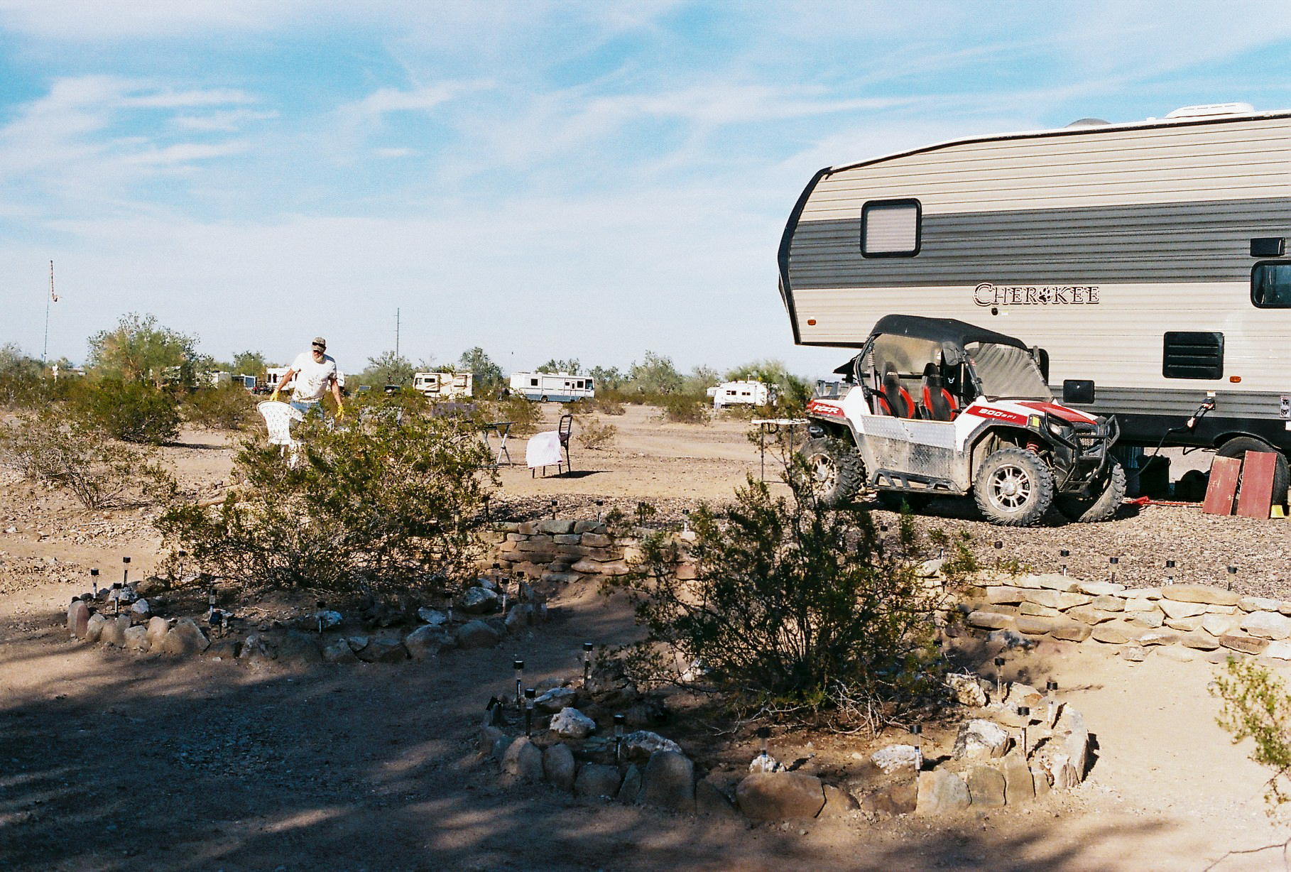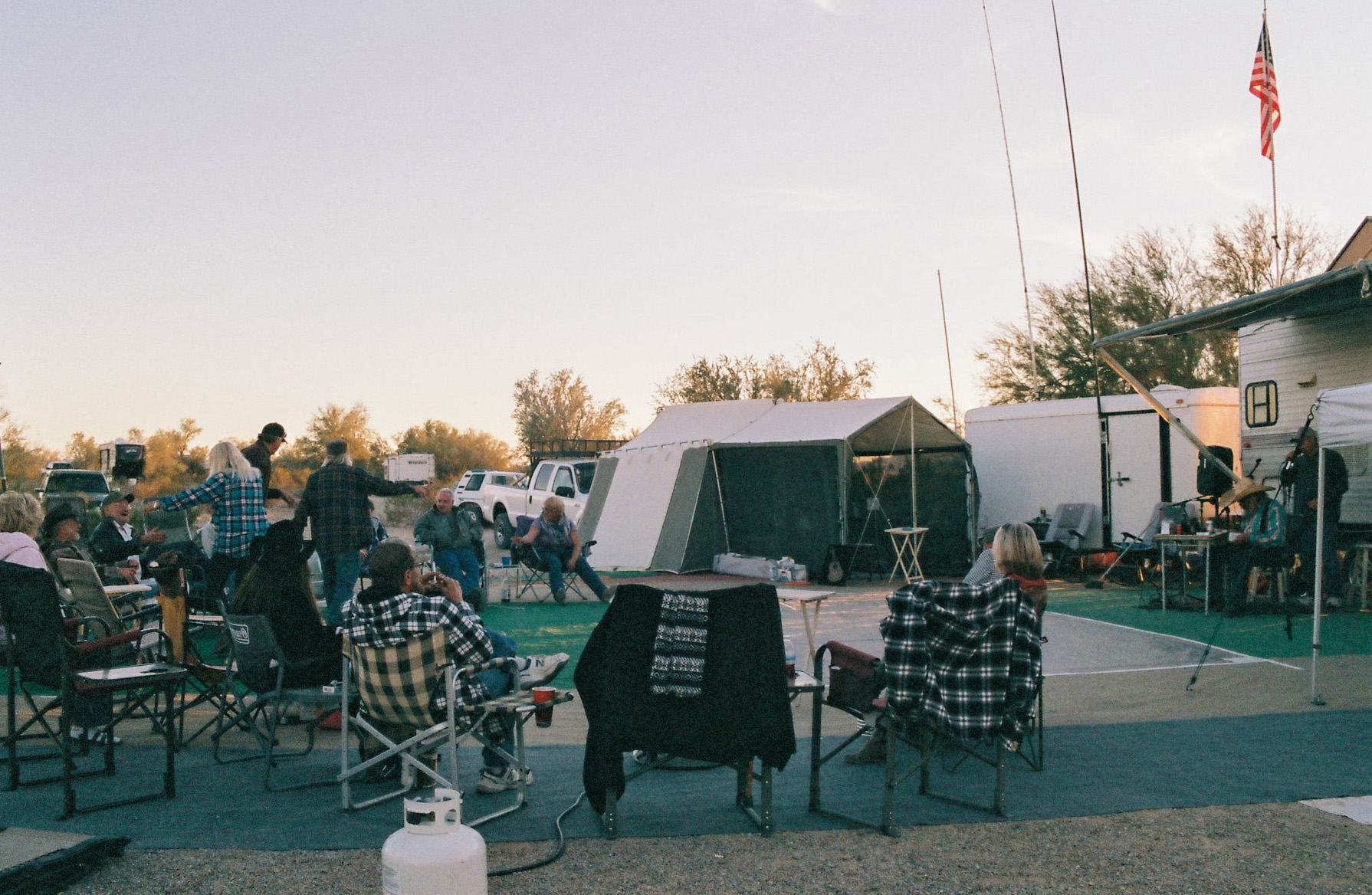 Janvier 2005. Désert de La Posa à Quartzsite, Arizona. Après plusieurs terrains dans des campings, parcs nationaux et stationnements Walmart (Forget 2012), je stationne mon véhicule récréatif (VR [1]) pour débuter un terrain de recherche dans les déserts d’Arizona et de Californie afin de saisir le mode de vie des personnes vivant à l’année dans leur VR. Reconnue comme la Mecque des camping-cars, Quartzsite, petite ville de 2 413 habitants [2], rassemble plus de 1,5 million de visiteurs chaque hiver, en particulier lors du Quartzsite RV Show en janvier. C’est une destination incontournable pour quiconque s’intéresse au monde du camping-car. Au sein de ce désert sont rassemblées des personnes vivant dans des modèles luxueux comme des modèles de base, voire faits maison, dans leur voiture, sous la tente ou sous des abris de fortune. Quartzsite compose ainsi une image du désert habité, loin des conceptions de solitude, de vide, de plénitude et de contemplation auxquelles le désert fait souvent référence.