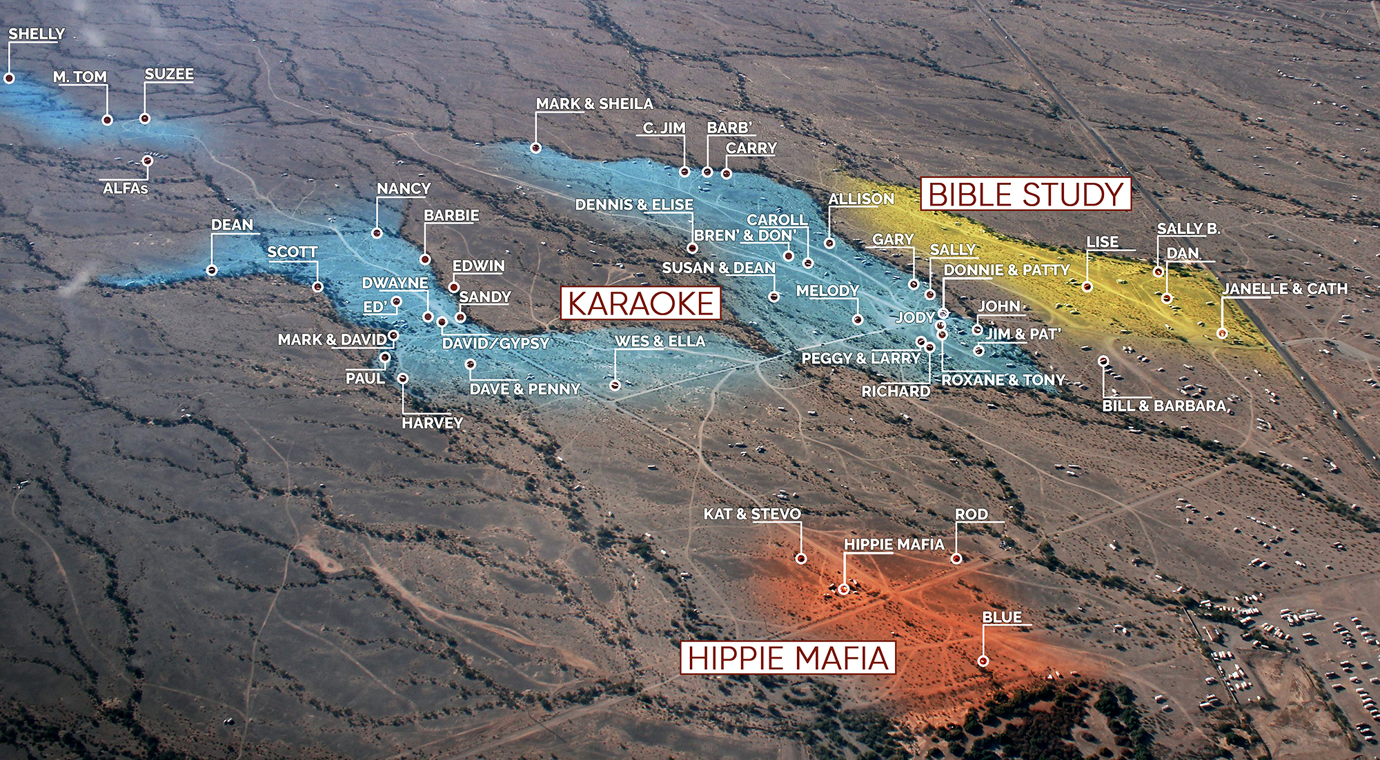 Dans un deuxième chapitre, Frati démontre que vivre à La Posa relève du don initial d’un espace où tout le monde est bienvenu. Même s’il ne s’agit pas complètement d’un don, puisqu’un coût, minime, est lié au stationnement, les LTVA demeurent les derniers espaces aux États-Unis où l’accessibilité à tous est le maître-mot. Tout le monde a le droit d’y élire résidence pour une durée déterminée et d’y créer son propre territoire, atténuant dès lors les différences et générant un sentiment d’égalité entre campeurs. « Ici, peu importe le prix de ton VR, tu vis pareil. Tu as le même soleil, le même terrain, y a pas de différence » (Forget 2012, p. 139). Les campeurs de La Posa ont la liberté totale de choisir leur lieu de stationnement, son orientation et sa taille, à l’unique condition qu’ils respectent la distance minimale imposée de 15 pieds (5 m) entre chaque emplacement. Comme l’observe Bruder (2019), « Le désert a beau réveiller l’esprit civique des campeurs, les gens ne changent pas : ils marquent leur territoire et se divisent en tribus » (p. 155). La délimitation spatiale se fait souvent avec des pierres ou matériaux trouvés dans le désert (figure 3). David Frati soulève avec finesse que l’appropriation du territoire sert à le marquer pour y revenir l’année suivante : les souvenirs des résidents habitués produisent « un cadastre virtuel » grâce à la mémoire collective du groupe (p. 114). Ce don initial d’un lieu de stationnement enclenche, selon Frati, un processus de socialisation à et par l’espace et l’adhésion à un mode d’échanges de dons.