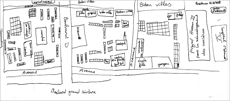 L’auteure fait le choix d’explorer la construction et le renouvellement de la modernité urbaine portée par les différents pouvoirs politiques en privilégiant une approche qui restitue le point de vue et le ressenti des habitants (chap. 2) : un espace vécu en décalage, voire en opposition, avec l’espace conçu par les politiques urbaines. Ainsi, en réponse aux critiques faites aux appropriations de l’architecture d’Écochard par les classes populaires, l’auteure mobilise la cartographie collaborative (figure 2) et place des appareils photo entre les mains des habitants afin qu’elles et ils dessinent et photographient leur quartier et leurs habitations. La ville moderne qu’incarnent les techniciens, voire les habitants de classes moyennes qui visitent le quartier lors de la journée du patrimoine organisée par l’association CasaMémoire est ainsi contestée de l’intérieur à travers les discours et les images produites depuis le Hay.