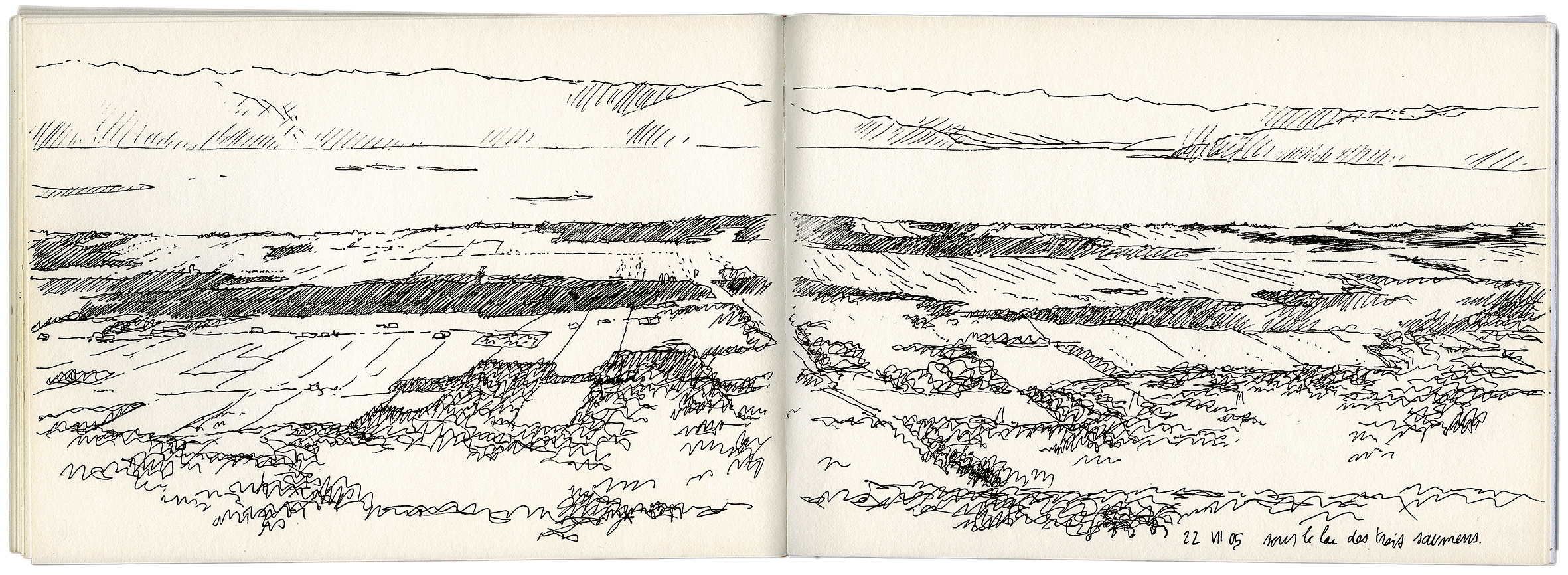 Alexis Pernet n’est pas qu’un paysagiste [3] au sens premier du terme, il est aussi paysagiste-concepteur et enseignant dans une école de paysage. Se présentant comme un « professionnel-explorateur », c’est donc un regard complet qu’il propose : de l’œil au trait, de la perception à la restitution puis à l’interprétation, et enfin à l’action collective – soit physiquement par le biais de l’aménagement, soit réglementairement par le biais de la planification. Ses voyages lui permettent d’interroger chacun des lieux qu’il arpente et retranscrit, mais aussi sa pratique en tant que paysagiste et dessinateur assidu.