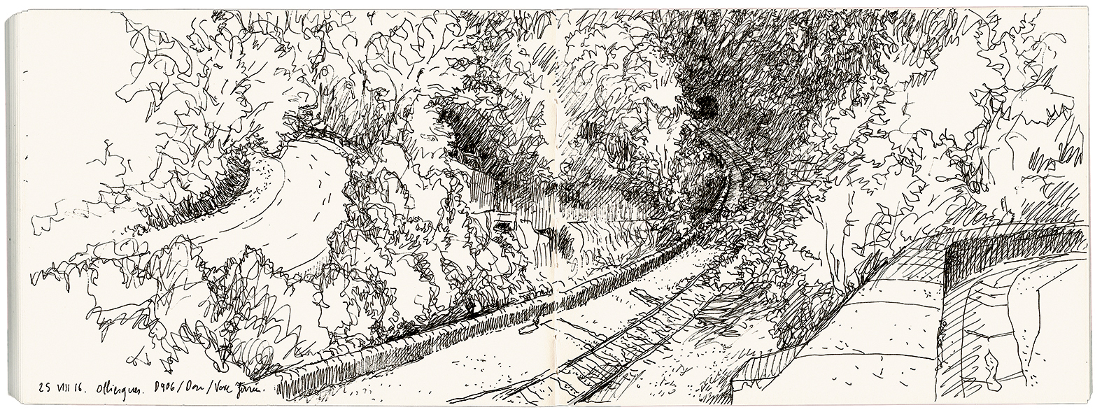 Au fil du trait est une ode à l’exploration, un voyage à l’ancienne où l’on prend le temps d’arpenter les lieux, de s’en imprégner en essayant de les décrypter et les comprendre ; et, enfin, de transcrire cette expérience par le trait, écrit et dessiné. « Le carnet de dessin est une technologie modeste » (p. 9), rappelle-t-il. « Aussi ce livre s’adresse-t-il, au final, à un public que je souhaiterais convaincre de la nécessité d’accorder à cette exploration du paysage le tempo qui lui convient » (p. 11). Une expérience de voyage low tech, comme il se plaît à dire, requiert de bonnes chaussures de marche, un carnet et un crayon comme seuls bagages afin de « transmettre l’émerveillement que peut susciter la rencontre avec un paysage » (p. 86).