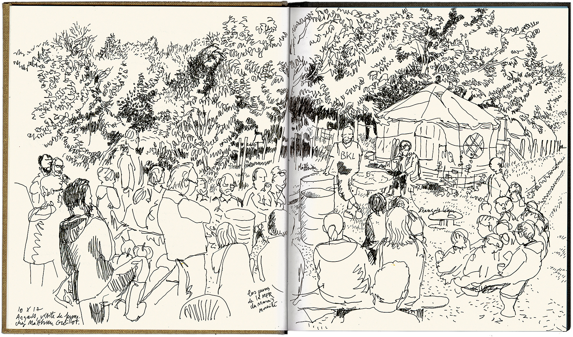 Au fil du trait propose d’arpenter aux côtés de l’auteur quelques morceaux choisis parmi ses nombreuses pérégrinations, menées dans le cadre de son activité professionnelle ou de résidences : six carnets correspondant à six lieux différents, quatre en France et deux sur le continent américain, font chacun l’objet d’un chapitre dédié et illustré. Les pages des carnets apparaissent dans leur forme brute, simplement reproduites, ce qui donne l’impression agréable de pouvoir les feuilleter. Les illustrations sont des croquis au trait, pris sur le vif, en noir et blanc, plus rarement avec un peu d’aquarelle ou d’encre. Ce mode de représentation n’est pas sans rappeler la publication des pléthoriques carnets de dessin de David Mangin (Mangin 2015).
