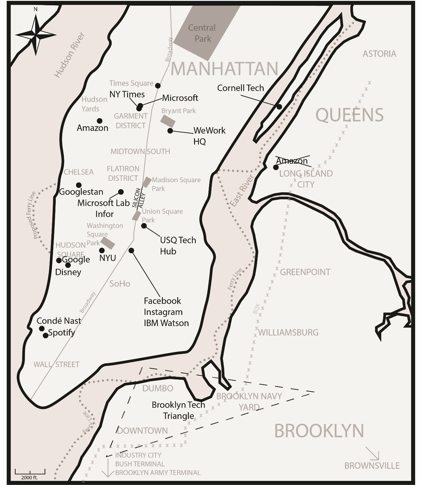 Since the Great Recession of 2008, New York City has emerged among the biggest “startup ecosystems” in the world (Mulas and Gastelu-Iturri 2016 ; Startup Genome 2019). Public- and private-sector investment, growth in tech jobs, and agglomeration of companies and coworking spaces have reshaped areas of Manhattan and Brooklyn into de facto “innovation districts” (see map below). These concentrations of tech firms emerged largely unplanned, in privately owned office buildings and old warehouses. But they have also developed on city-owned land, with city government support, mainly from the New York City Economic Development Corporation (NYCEDC), a public agency.
