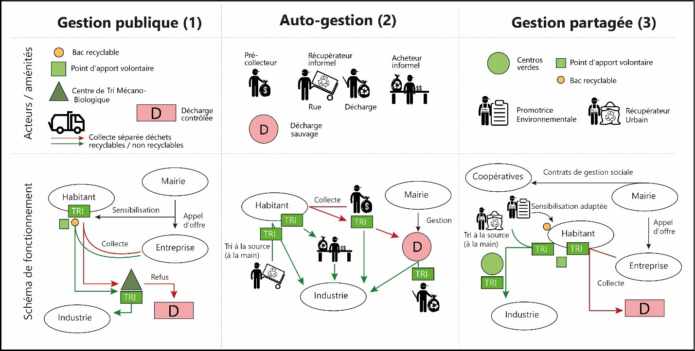 La coexistence de ces deux premiers modèles implique pour la municipalité des investissements dans les infrastructures (centres d’enfouissements, centres de tri mécano-biologique, incinérateurs…). C’est pourquoi, face aux difficultés budgétaires et aux demandes des populations, les villes latino-américaines optent de plus en plus pour des modes « innovants » de gestion partagée (3) (Durand et De Oliveira Neves 2019).