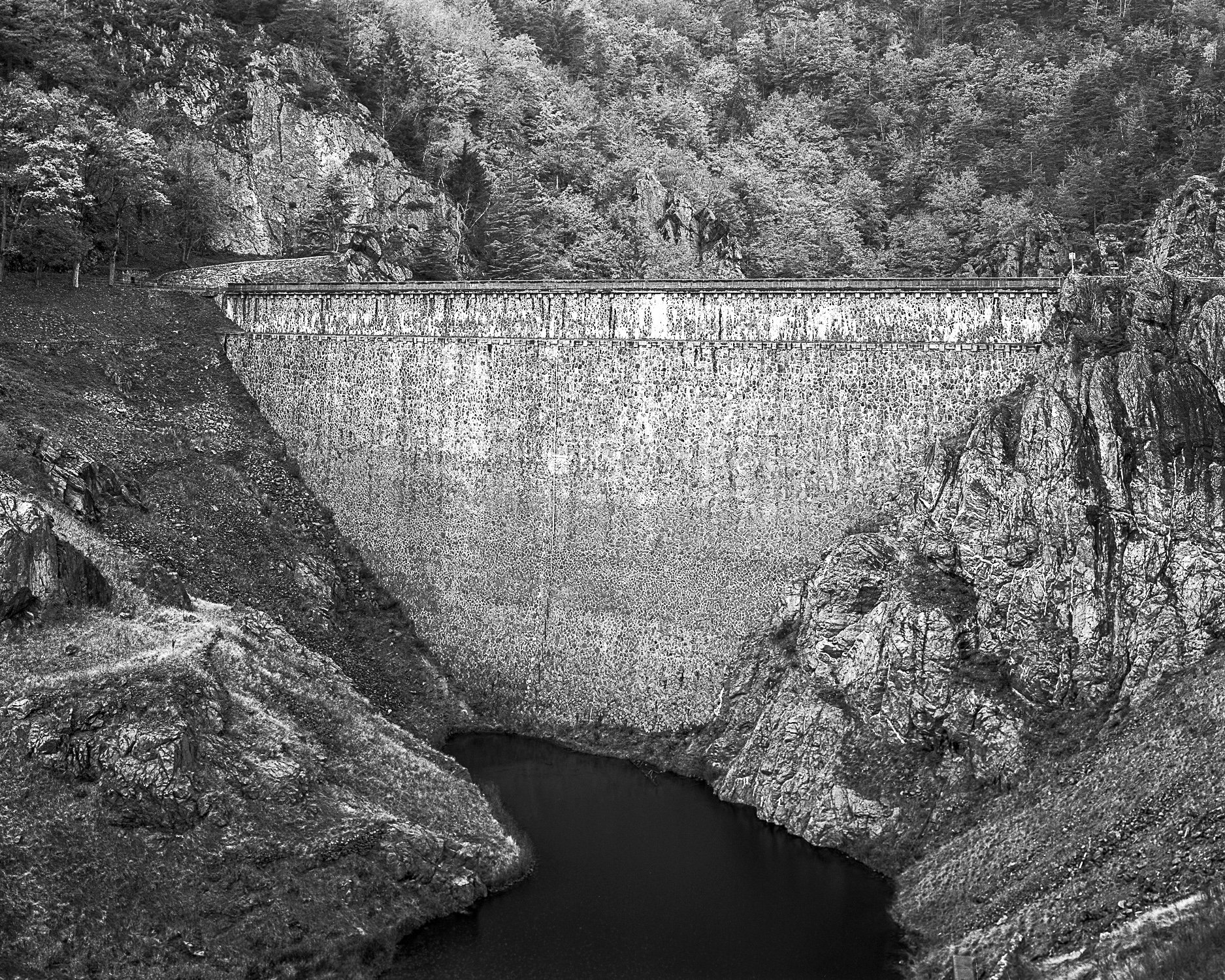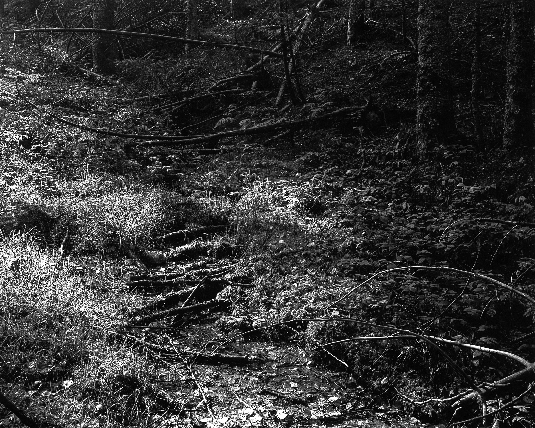 Ces photographies représentent la rivière de sa source dans les monts du Pilat à sa confluence avec la Loire, les sites s’enchaînant en un long travelling au sein de l’ouvrage, comme ils le font géographiquement sur le terrain. Pierre Suchet a mené ce travail pendant plus de dix-huit mois, préparant ses séances de prises de vues à partir d’une documentation [cartographique>1544] et d’archives visuelles anciennes [1]. La série de photographies représente des sous-bois montagneux, des ouvrages d’ingénierie hydroélectrique du XIXe siècle, des espaces urbains (sous lesquels coule la rivière), des zones périphériques où se côtoient bords de route, industries, habitations, pour finir par une morphologie plus naturelle aux abords de la Loire. Les clichés redonnent ainsi à voir un cours d’eau relégué et effacé du paysage, le photographe ayant construit ses points de vue en trouvant malgré tout des accès aux berges pour y installer son trépied. L’usage de la chambre entraîne une finesse de restitution des ambiances lumineuses, valorisant les qualités de réflexion des matières (arbres, murs, chaussée, etc.), servant la perception des détails.