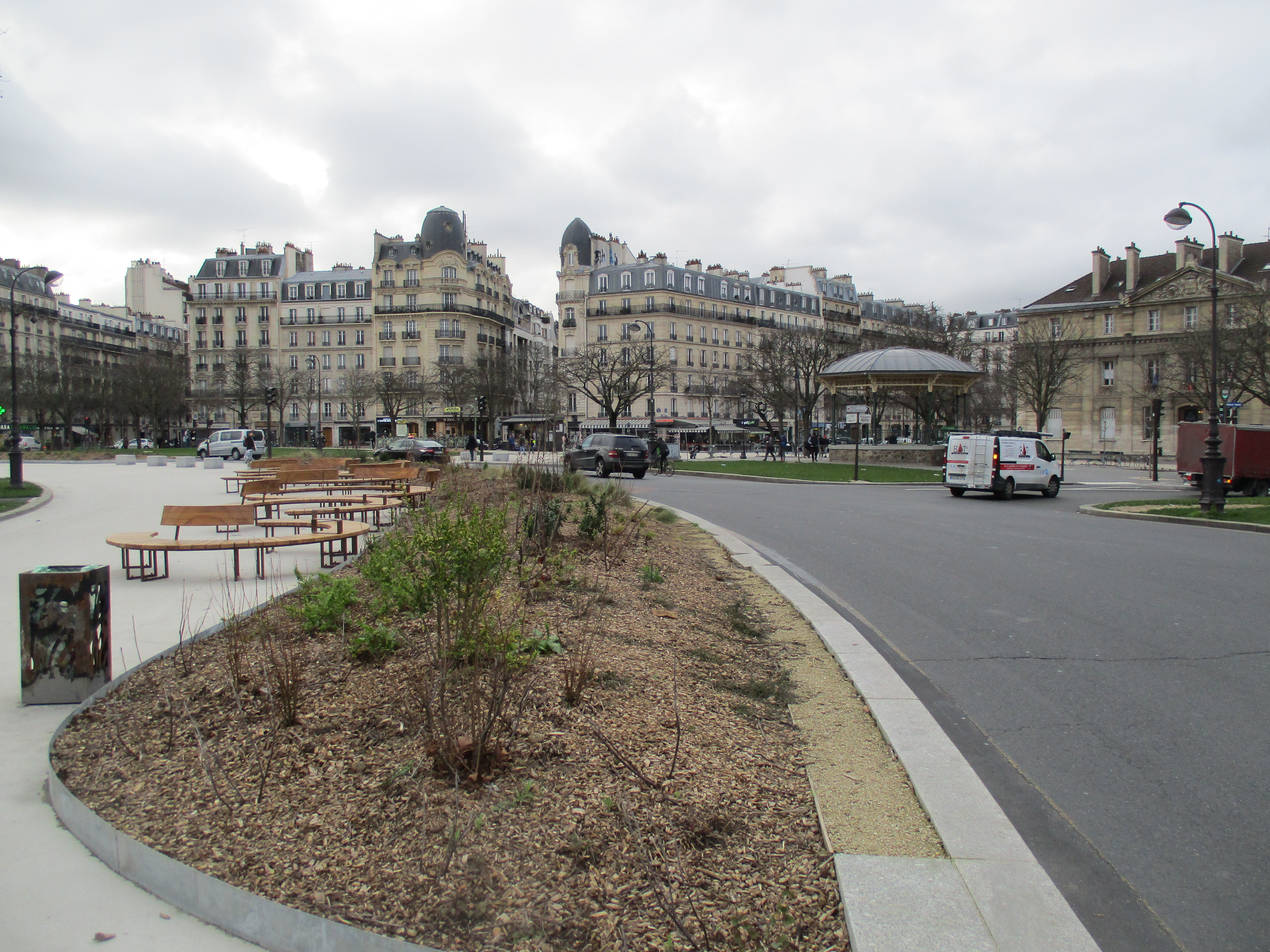 Après le réaménagement de la place de la République en 2013, la Ville de Paris a lancé celui de sept autres places parisiennes pour 2018-2019. Ces places, réduites à la fonction de grands carrefours routiers, ont été réaménagées au profit des mobilités douces. La réduction du nombre de voies routières au lieu de la suppression pure et simple de la circulation automobile a permis une relativement bonne acceptation par les automobilistes, et les réaménagements proposés sont peu critiqués. La place de la Nation (figure 2) est ainsi passée de huit à quatre voies de circulations, avec des franchissements piétons facilités. La réduction des distances de traversée piétonne procure des gains en termes de sécurité (OMS 2013). L’augmentation des distances entre les voies routières et les bâtiments réduit les nuisances sonores pour les résidents. La surface rendue aux piétons par l’ensemble des modifications sur les sept places sera équivalente à celle restituée par le projet des berges de Seine.