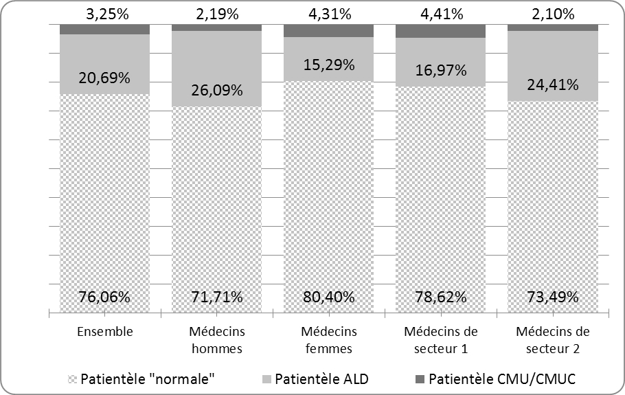 Afin d’étudier les effets de cette dernière forme de concurrence sur la distribution des patients parmi les omnipraticiens entrants, leurs patientèles ont été scindées en trois grandes catégories. La première (58 % de la patientèle étudiée) regroupe des individus sans caractéristique particulière. La deuxième (36 % de la patientèle) regroupe des bénéficiaires du régime des ALD, c’est-à-dire d’une pathologie qui ouvre droit à une exonération du ticket modérateur. Enfin, la troisième catégorie (6 % de la patientèle) regroupe des bénéficiaires de la couverture maladie universelle (CMU). Cette dernière catégorie est plus jeune, plus féminine et pose des problèmes de santé spécifiques.