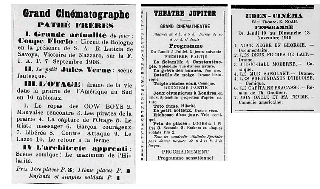 En présence de la vogue que les spectacles cinématographiques obtiennent en notre ville, la direction de la maison Pathé de Paris a décidé d’ouvrir à Salonique un établissement où il n’y aura que de véritables films Pathé. […] Pour commencer, il y aura changement de programme trois fois par semaine et éventuellement tous les jours.