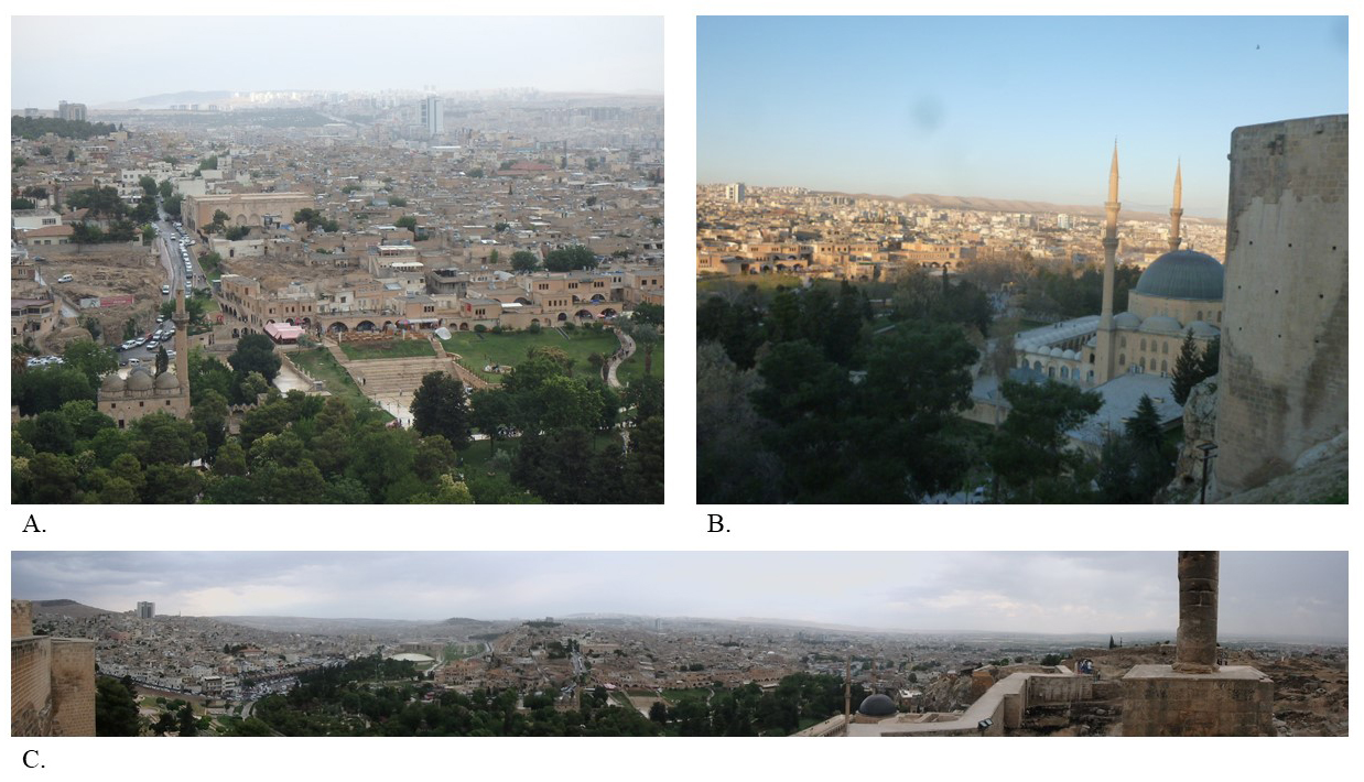 La citadelle (en haut de laquelle se situe le photographe pour les documents A, B et C) surplombe la cité historique de Şanlıurfa. La mosquée Rizvaniye (en bas à gauche de la photographie A) et la mosquée Mevlid’i Halil (B) constituent, avec le Balıklıgöl (D) et la grotte du prophète Abraham (E) qui les jouxtent, le site de la ville le plus fréquenté par les touristes et pèlerins musulmans.