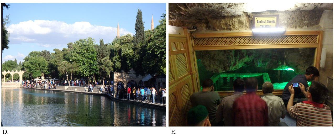 Cette politique de standardisation et d’uniformisation de l’espace commercial n’est par ailleurs pas incompatible avec une recherche d’identité touristique distincte. Les autorités publiques, consensuellement acquises à la stratégie de promotion de Şanlıurfa comme « ville des prophètes », mettent en scène son identité de ville sainte par l’aménagement d’un lieu de pèlerinage exclusivement islamique à l’entour du présumé lieu de naissance du prophète Abraham. La mosquée Mevlid-i Halil, ainsi qu’un espace de recueillement à la mémoire du penseur musulman Said Nursi, décédé à Urfa en 1960, sont adossés à la caverne. Le Balıklıgöl, un ensemble de bassins, organise le parcours des touristes-pèlerins entre les trois mosquées du site. L’aménagement et la gestion de cet espace du site protégé, confié à une fondation sous tutelle de la préfecture, privilégient l’expérience des croyants musulmans par-delà toute autre considération. C’est ce que montre l’absence d’une promotion d’un dialogue des religions – ou à tout le moins d’un multiculturalisme qui a pu guider les politiques patrimoniales et touristiques de Diyarbakır –, qui aurait pu être élaborée autour de la figure d’Abraham.