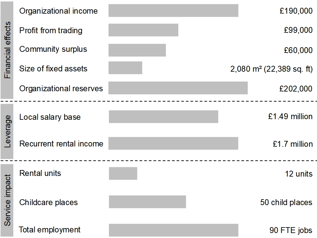 And yet, as Figure 2 shows, the community now owns £1.7 million worth of assets, generates a rental income of £190,000 per annum and provides 12 new shops and services that were not there before the project started. The œuvre is the acquisition of assets, bringing in new forms of collective ownership and exploiting property rights to deliver alternative forms of development, cash income and locally useful services. The childcare center has created 50 new places and the complex now employs 90 people within the local community. This has created salary spending worth £1.49 million, and each year the company makes a profit of £99,000. Under the terms of the constitution, one third of the profits are allocated to each community forum and one third is retained by the company. This community surplus has funded access scholarships to university, youth programs, education development for children failing at school, as well as environmental improvements. Violence at the interface has been nearly eradicated, 90% of residents support the initiative, and only 14% on both sides together thought that the peacebuilding approach was not effective (Knox and Quirk 2016).