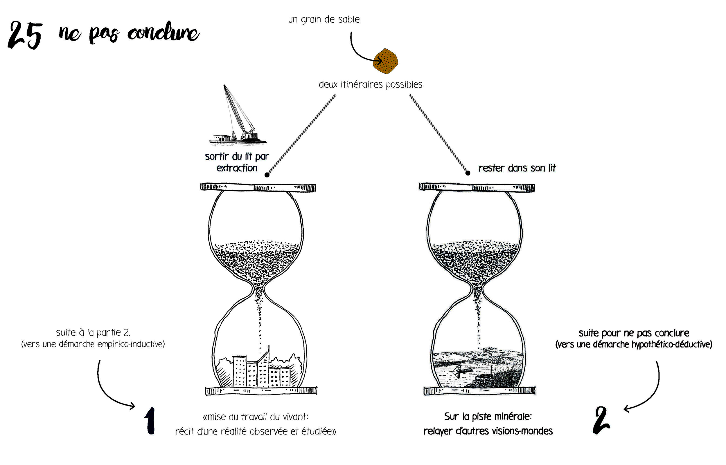 L’autrice interroge ainsi la soutenabilité sociale et environnementale de ces extractions et des pratiques d’aménagement qui les suscitent. Cette ville, bâtie sur du sable, a-t-elle des fondations solides ? Elle met en évidence à la fois les déstabilisations sur les sociétés humaines, l’économie vivrière autour des différents types d’espaces humides dans la région, et les écosystèmes vivants en général et plaide pour une prise en compte des terres et des lacs comme des biens communs. Le livre se fait alors plus prospectif et le dessin revêt une dimension moins illustrative et plus spéculative (Allagnat et al. 2024). Alors que l’enquête s’est intéressée à l’itinéraire suivi par le sable qui bifurque de son lit pour entrer dans la production urbaine capitaliste, l’autrice nous invite à imaginer un autre itinéraire possible, une autre bifurcation, plus proche de la notion de bifurcation écologique, qui s’appuierait sur l’arrêt des extractions de sable (figure 4). Quelles villes et vies urbaines deviennent alors possibles ? À nous de suivre cette « piste minérale » et d’inventer les formes urbaines à venir.