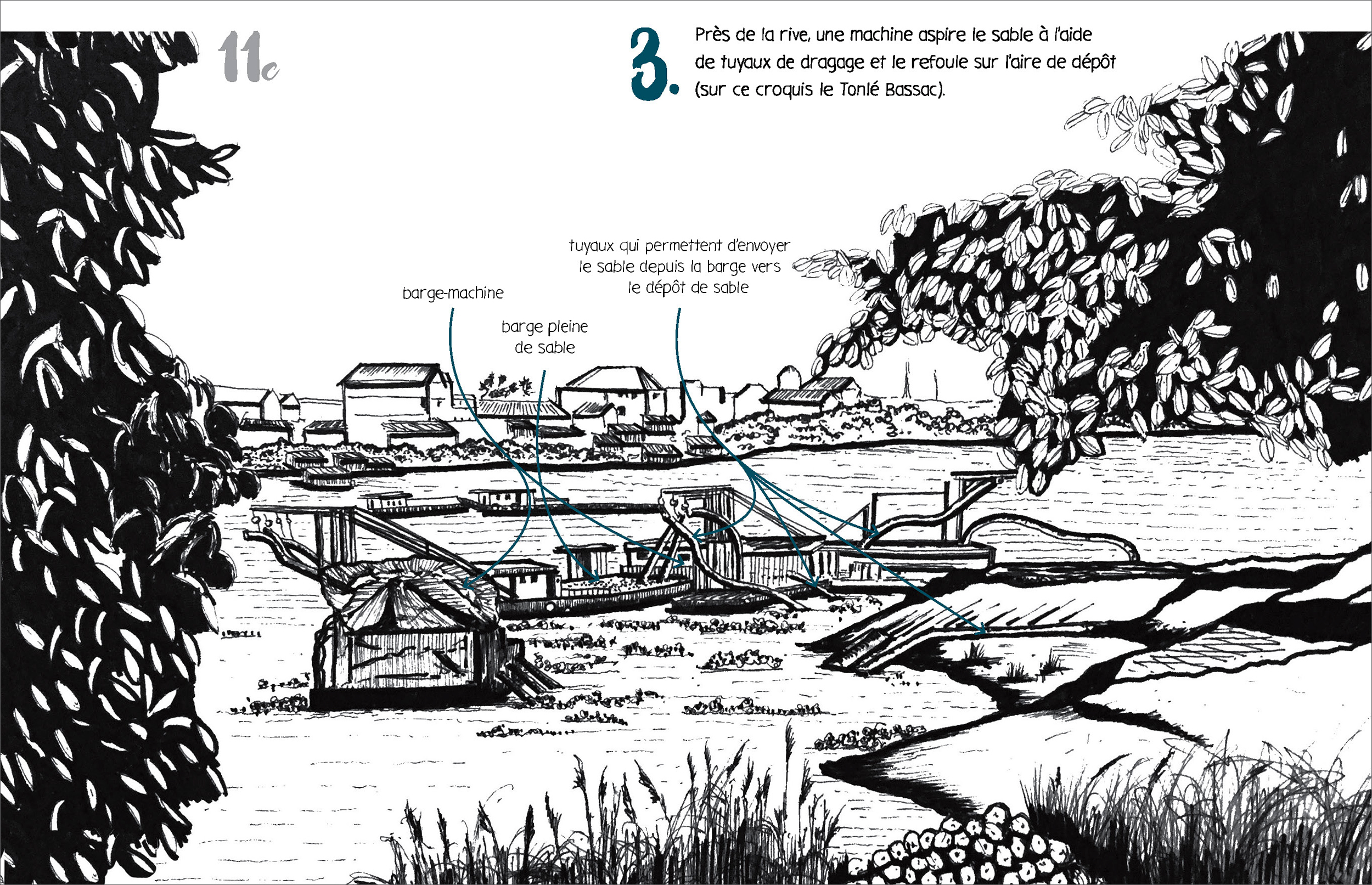 Dolorès Bertrais nous invite à suivre l’itinéraire d’un grain de sable qui dévie de son devenir sédimentaire pour intégrer les filières de production de béton et de remblais à Phnom Penh. Le livre est organisé autour d’un cahier central dessiné, qui restitue de manière sensible le fonctionnement de la filière : ses acteurs, son organisation spatiale, les relations matérielles et économiques qu’elle organise entre différents lieux et acteurs de la ville. Il fourmille d’informations, sous forme de bulles, de cartes, de croquis, qu’on décortique tout au long de la lecture par aller-retour avec le texte, grâce à un système de renvoi bien pensé. Le cahier met en scène un duo de grains de sable dont les apartés racontent à la fois le devenir du sable et les conditions de l’enquête, interrogeant ses limites et les données qui restent à consolider (figure 1). Il propose ainsi un récit qui peut se lire indépendamment avec grand plaisir, à la manière d’une bande dessinée.