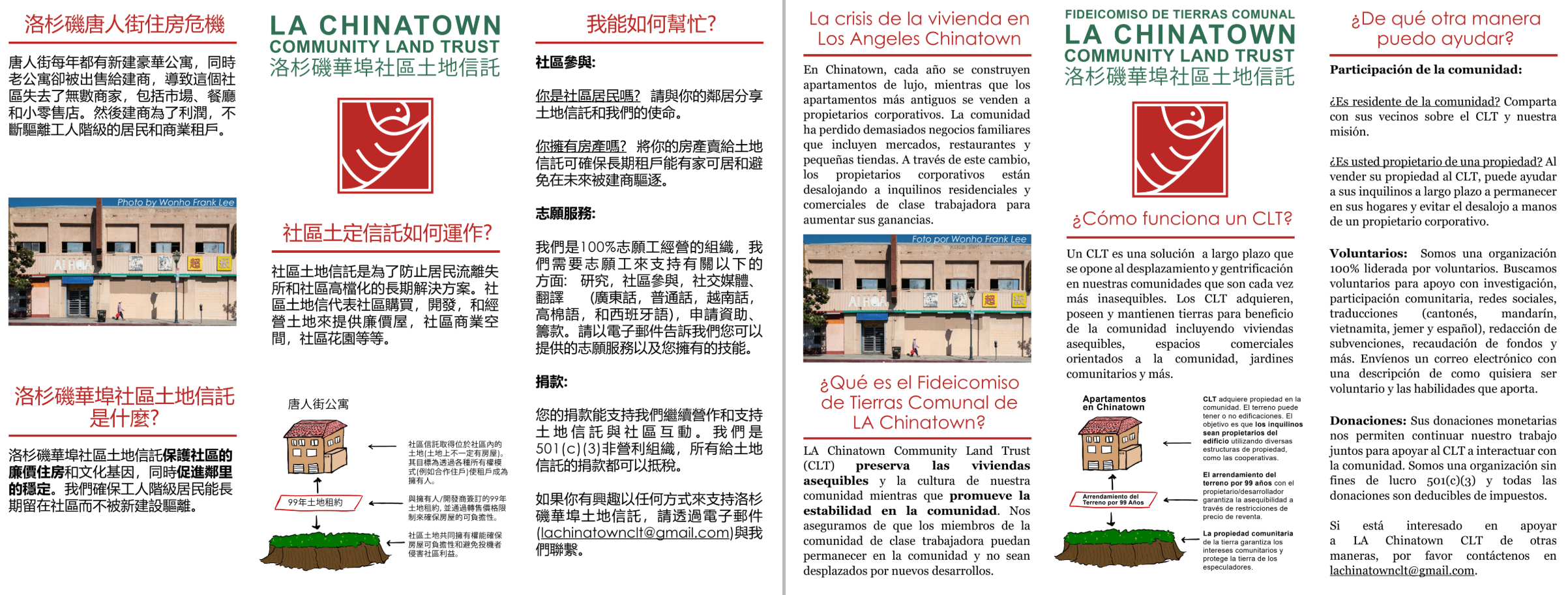 The LA Chinatown CLT was born out of the fight against displacement in the Los Angeles Chinatown community. While the CLT is one potential model—it is just one model. The process of developing the CLT has not been without its issues and challenges : building trust in the community and with its membership, and also searching for the appropriate financing for its project acquisitions. However, the success of the CLT will not just be through its community-stewarded land ; it will also be through how it gets there. Continuing to build closer relationships with residents and organizers, and ensuring everyone in the community is brought along together, will be how the LA Chinatown CLT succeeds.