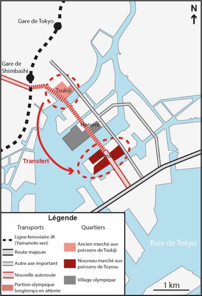 However, as the new buildings at Toyosu were completed at the end of 2016, a further soil survey revealed a level of contamination too high for food logistics activities, halting the move from Tsukiji. The dismantling of the site, and thus the construction of the portion of the road to Harumi, was accordingly suspended. This unexpected environmental issue was a major political and urbanistic obstacle in the preparatory phase of the Games between 2016 and 2018. The situation was resolved in extremis : the new Toyosu market opened on October 11, 2018, following cleanup and political agreements, the old Tsukiji site was destroyed, and the road was completed by the end of 2019, making access to the athletes’ village operational (Figure 2).