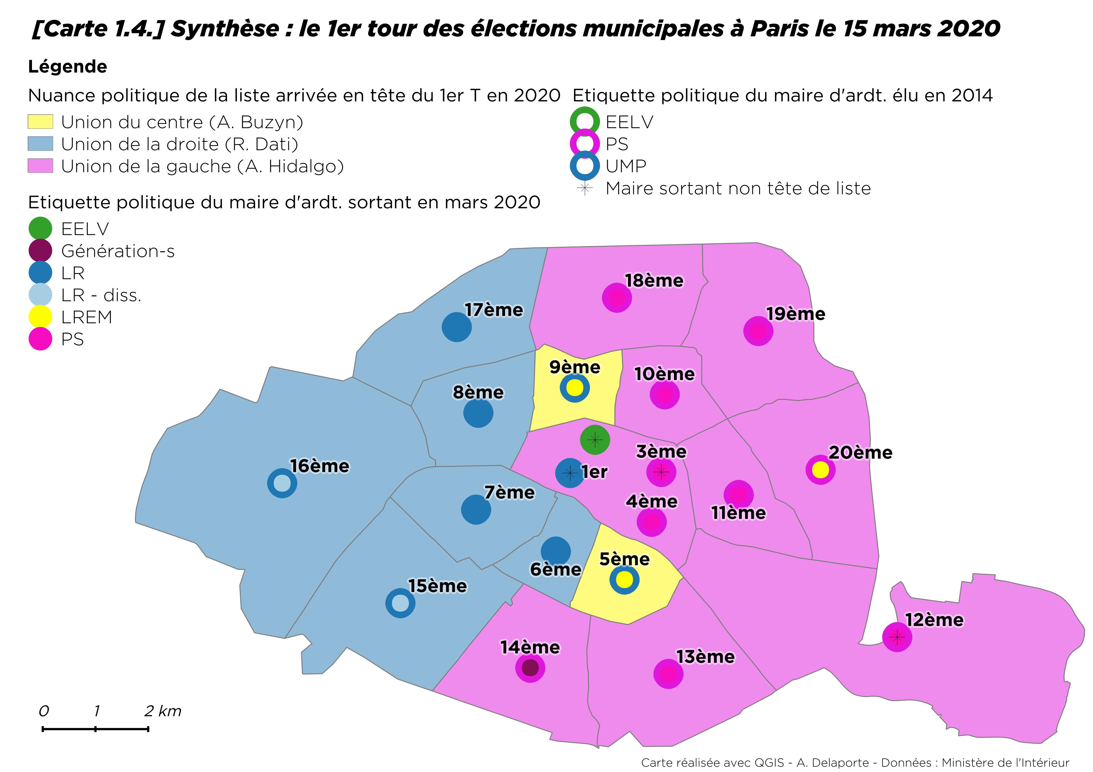 Les élections parisiennes constituaient une très attendue mise à l’épreuve électorale et locale de « l’entreprise Macron » (Dolez, Fretel et Lefebvre 2019). Dans l’ensemble du pays, ces élections ont été marquées par le foisonnement des listes et l’hétérogénéité des alliances, rendant plus difficile une interprétation des résultats. L’exposition médiatique des municipales à Paris favorise néanmoins les lectures nationalisées du scrutin, en termes de succès ou d’échec de l’exécutif : objectif de conquête officiellement revendiqué par le parti présidentiel, la capitale constitue un terrain privilégié d’observation des recompositions de l’offre politique et partisane que l’élection présidentielle de 2017 a accélérées. Or, ce premier tour laisse plutôt apparaître une résurgence « classique » du clivage gauche-droite, malgré l’apparition de LREM, sur la scène parisienne. La continuité historique des clivages politiques et géographiques de Paris (Ranger 1977 ; Agrikoliansky 2017) se voit ainsi réaffirmée : l’est de Paris vote toujours massivement à gauche, quand l’ouest penche encore plus clairement à droite.