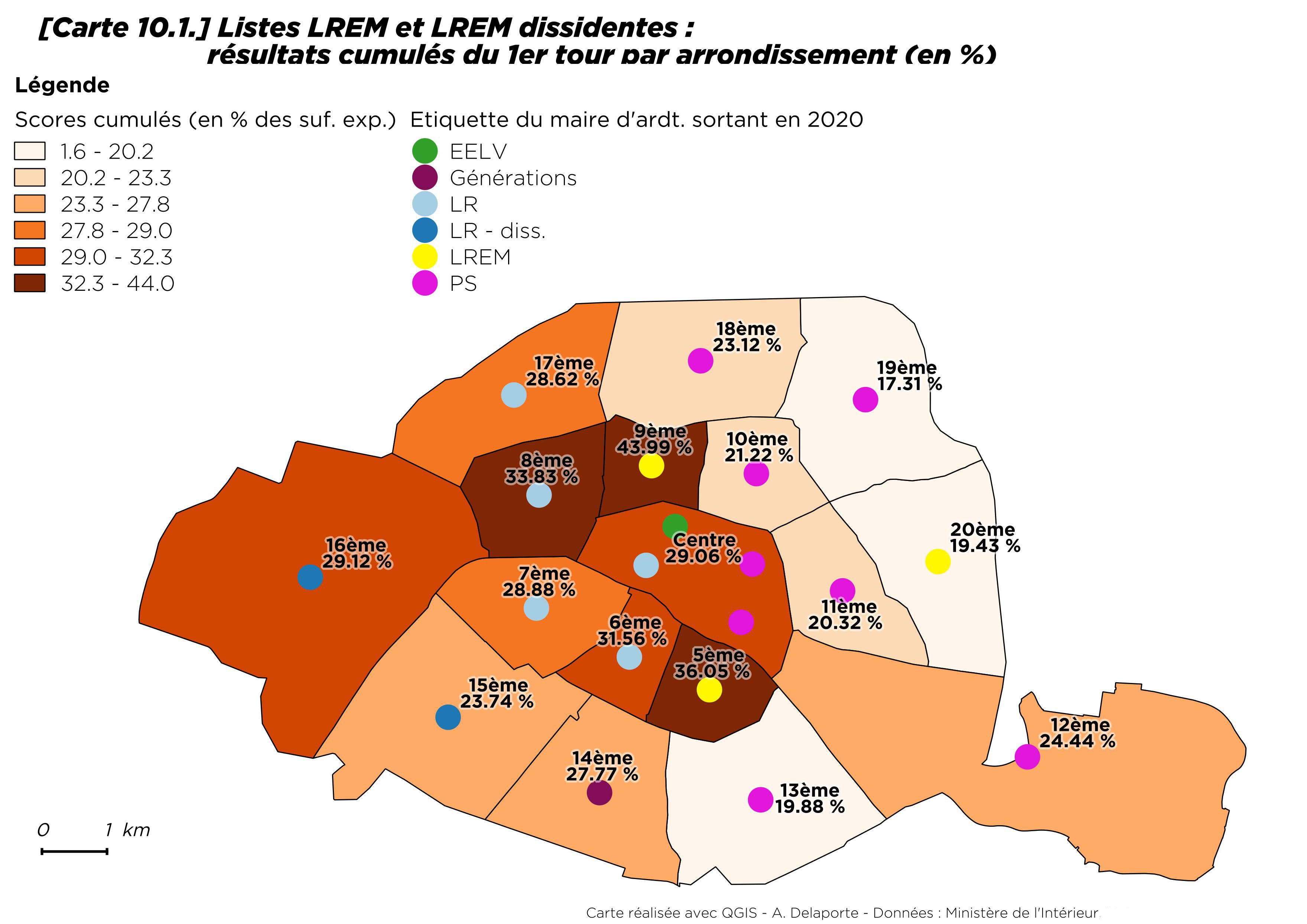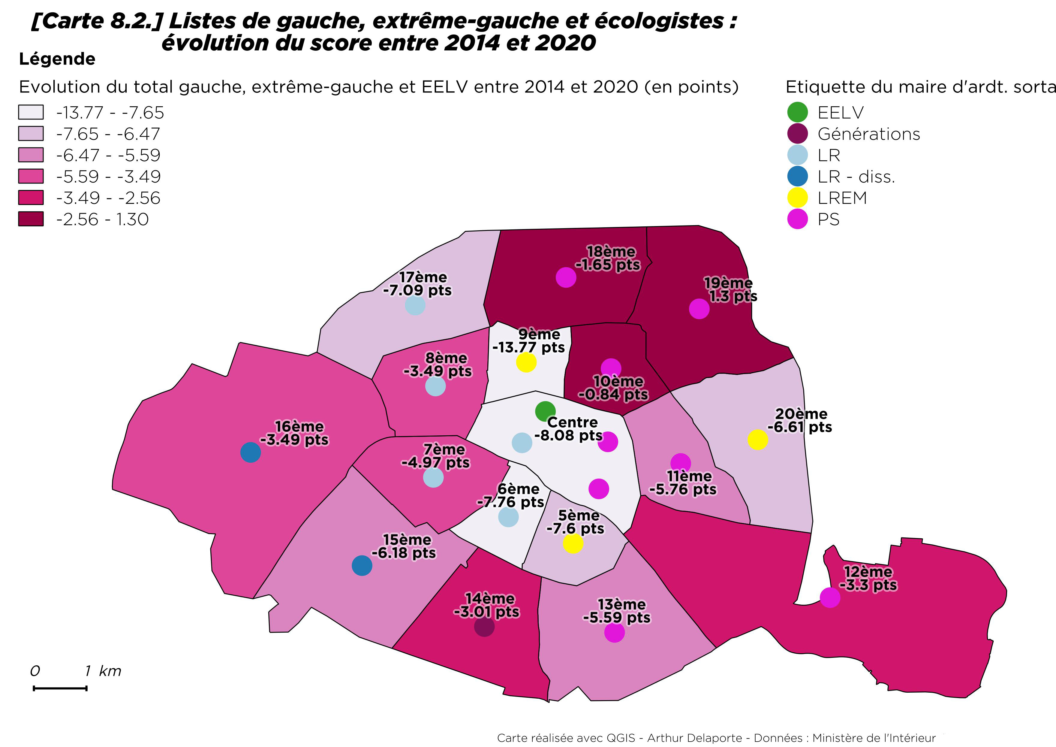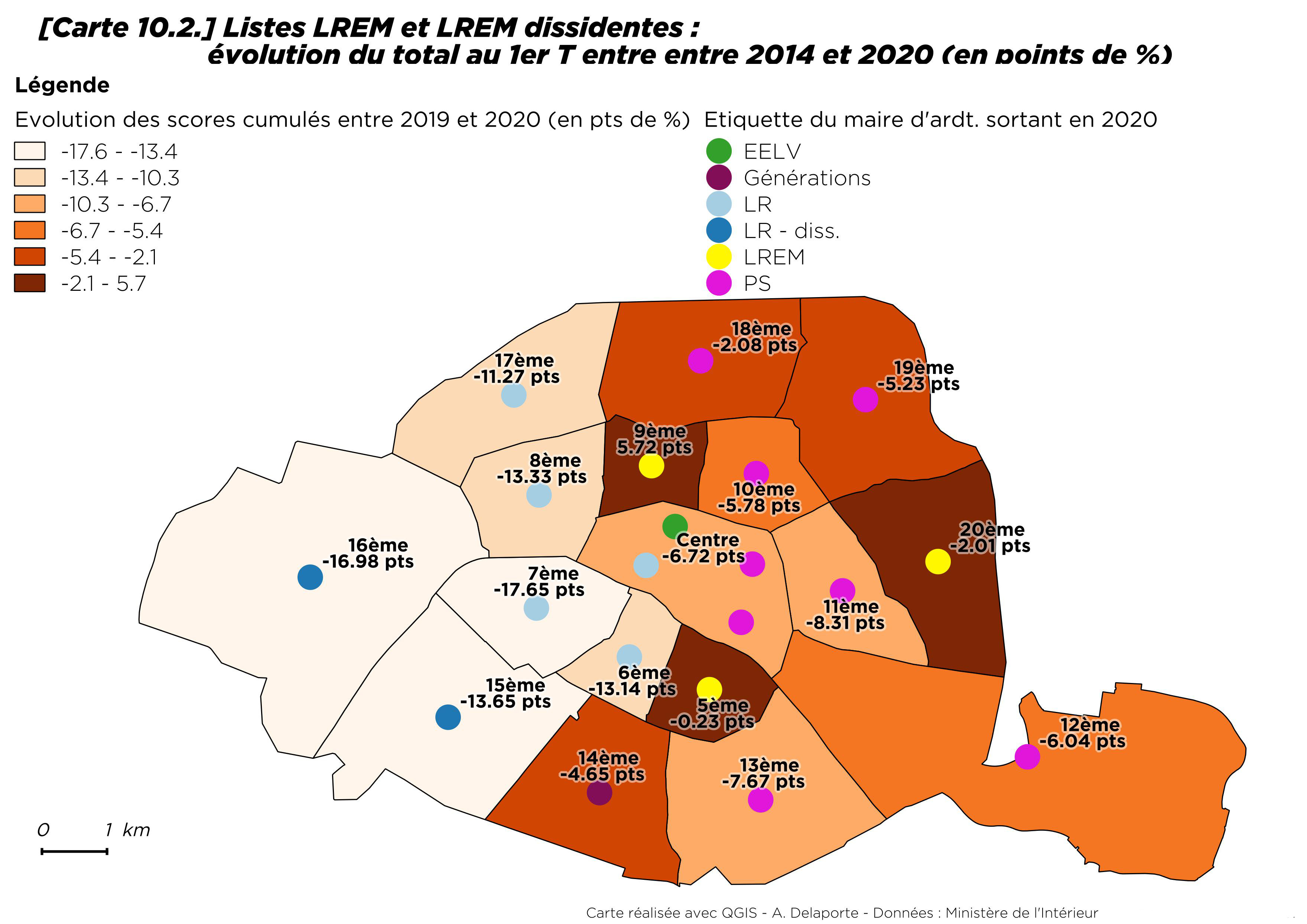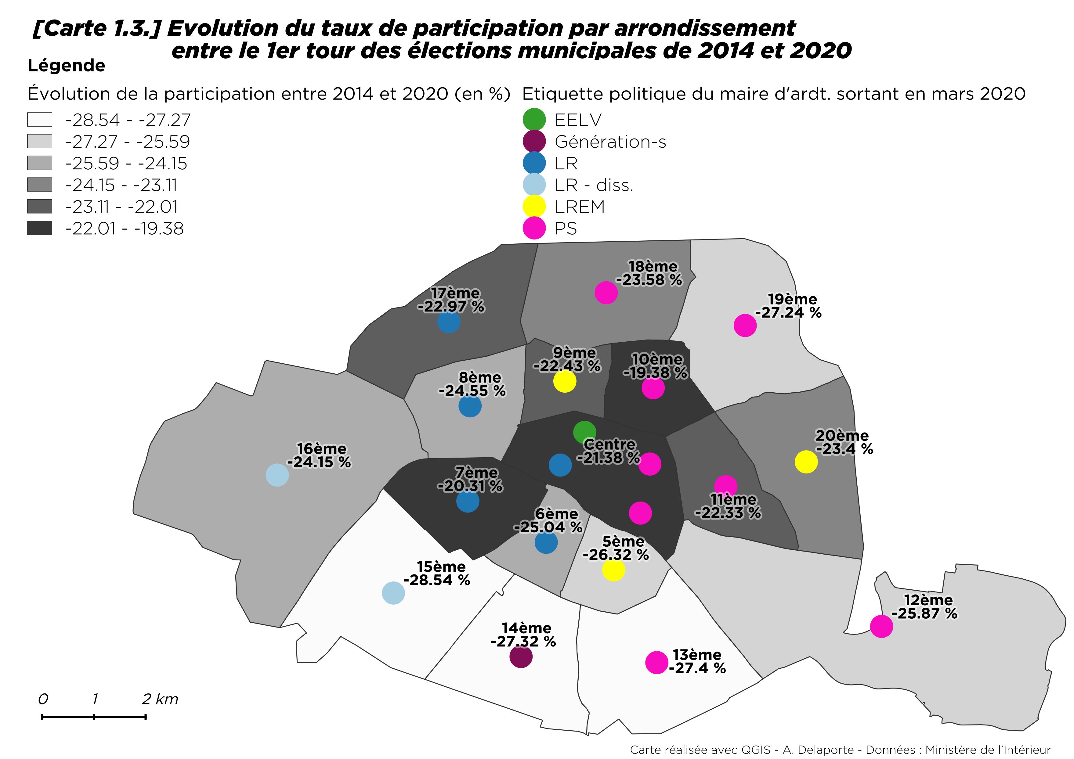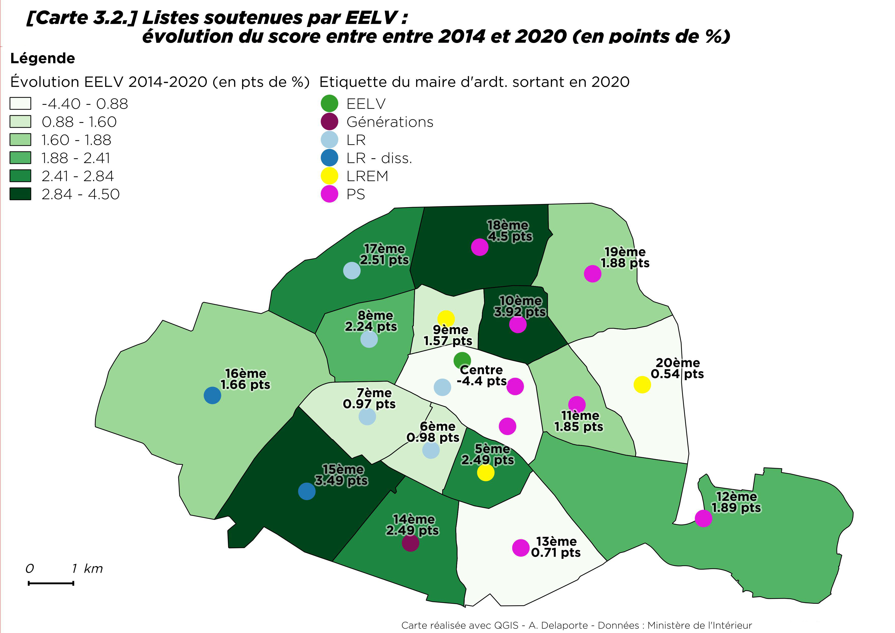 Par rapport à 2014, la progression du vote écologiste est néanmoins sensible, tout en restant modérée dans le 13e et le 20e arrondissement [8] où il progresse de moins d’un point. Le seul arrondissement où les écologistes reculent est Paris Centre (- 4,4 points). À Paris comme ailleurs, les maires ont souvent bénéficié de la prime au sortant.