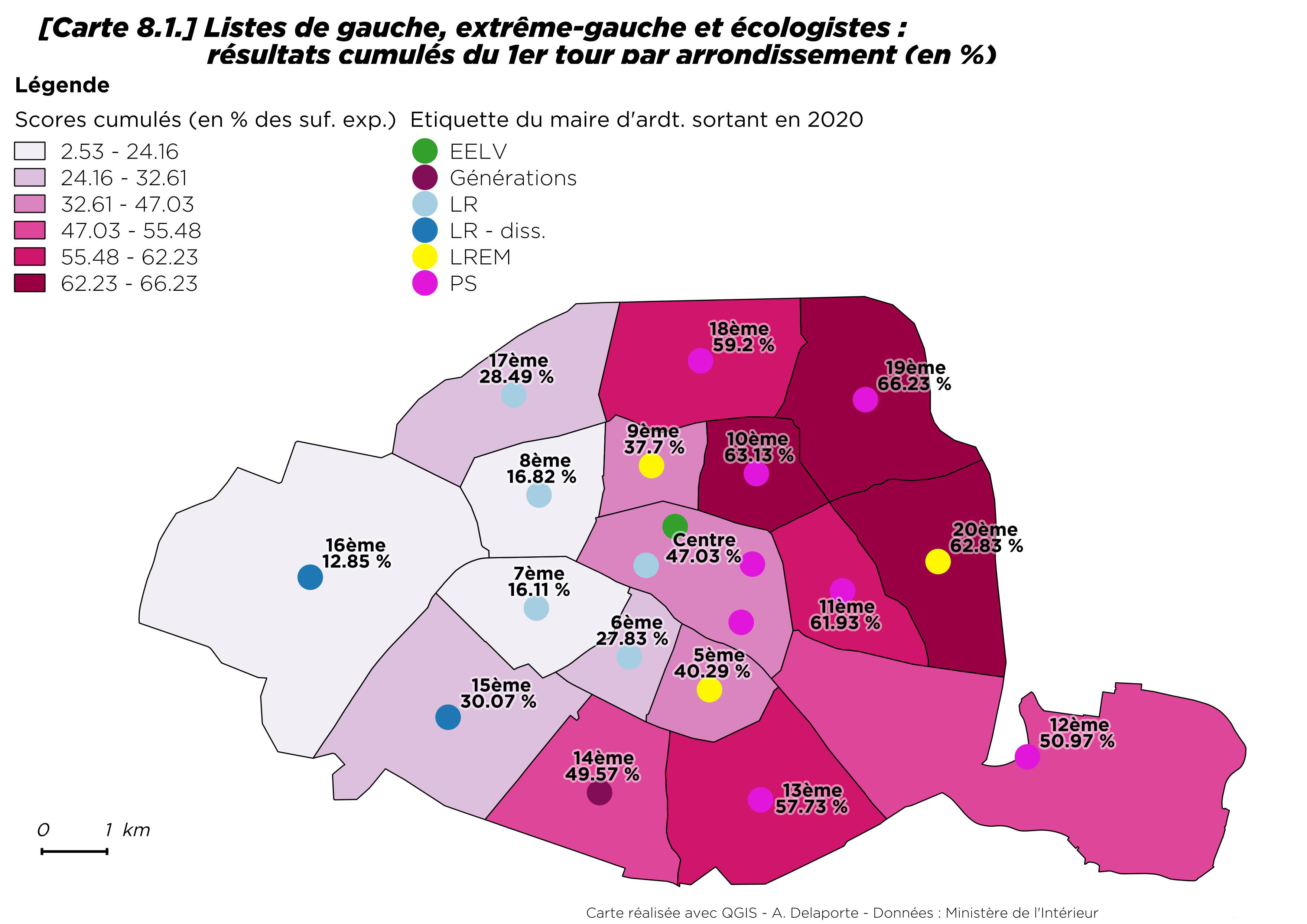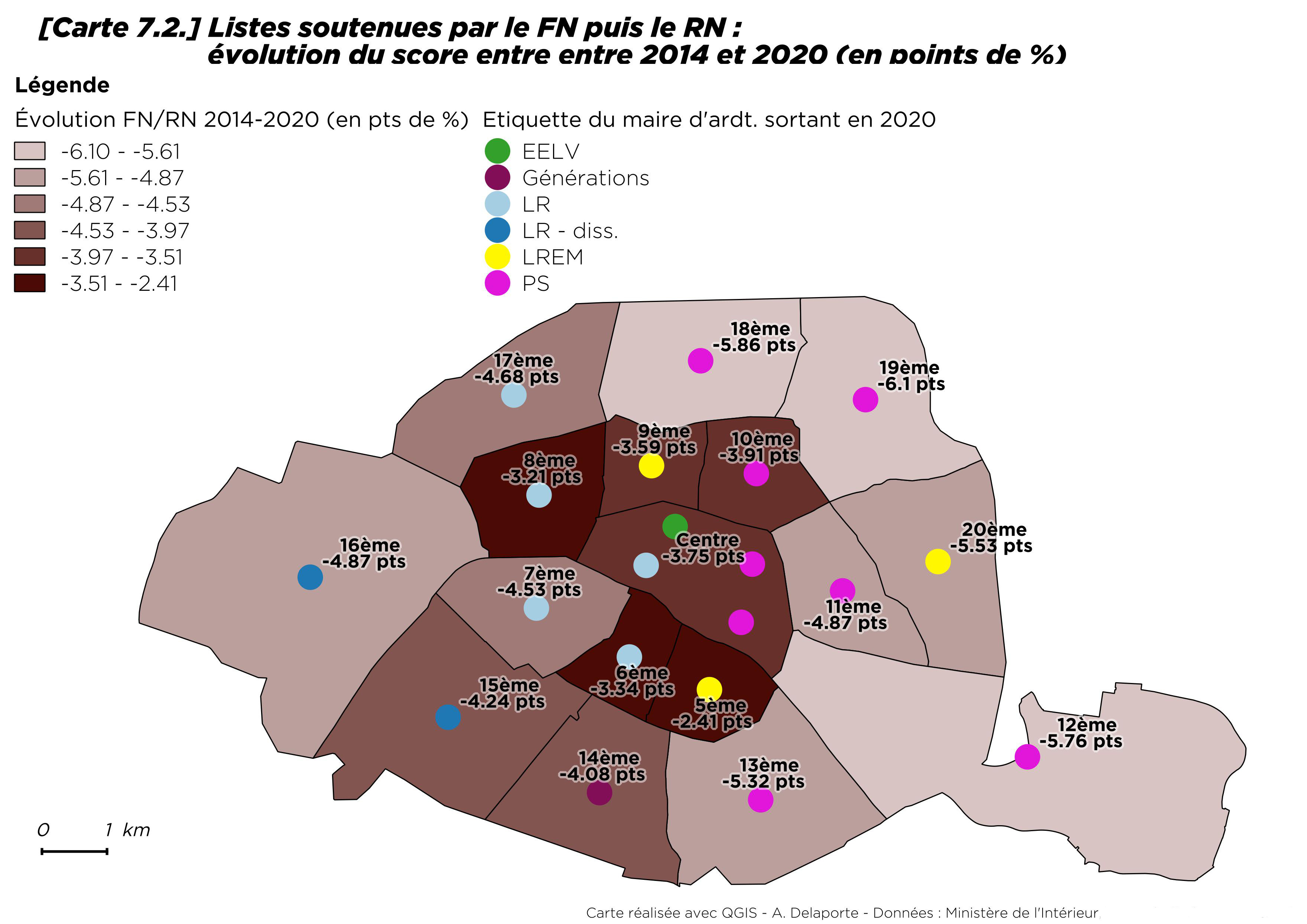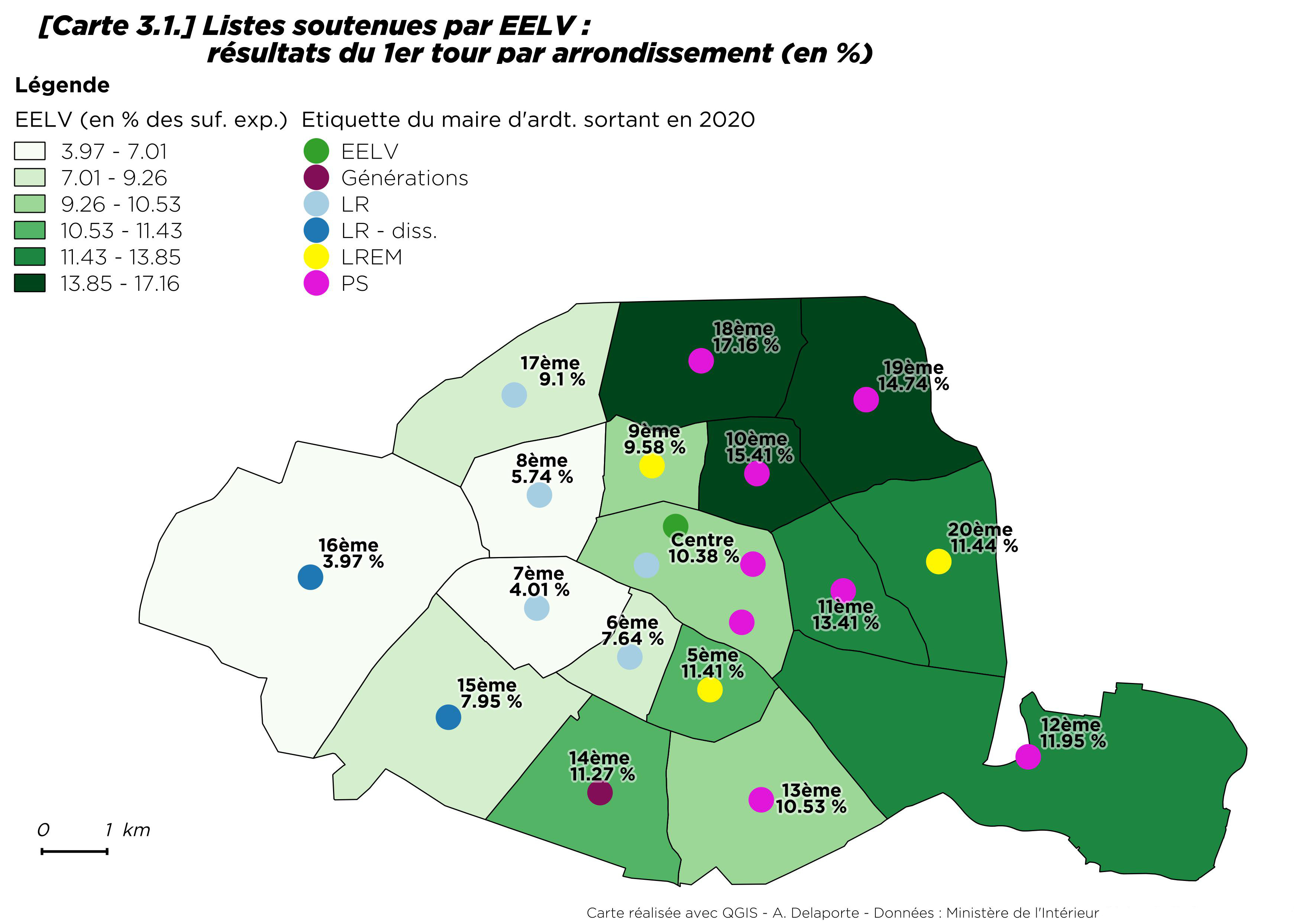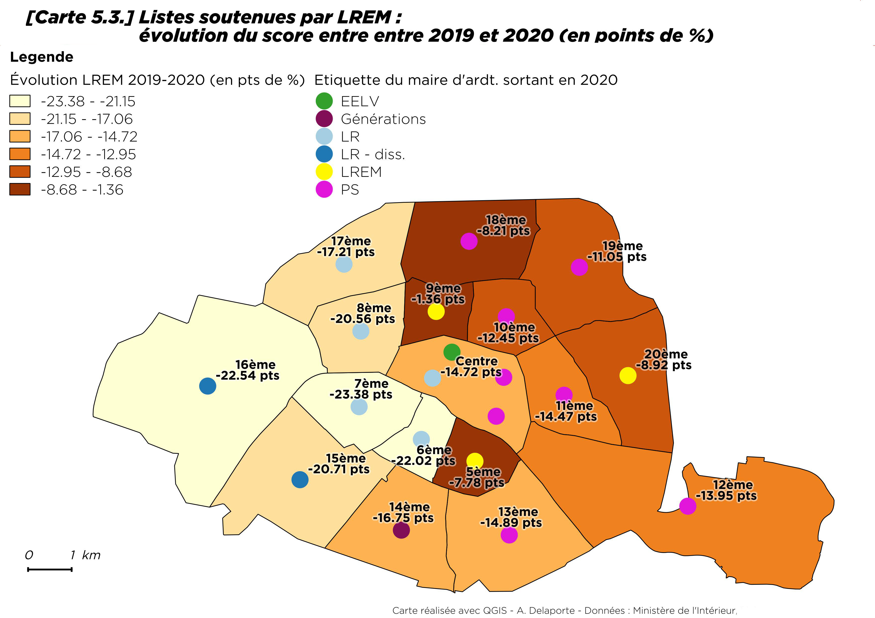 Par rapport à 2014, la progression du vote écologiste est néanmoins sensible, tout en restant modérée dans le 13e et le 20e arrondissement [8] où il progresse de moins d’un point. Le seul arrondissement où les écologistes reculent est Paris Centre (- 4,4 points). À Paris comme ailleurs, les maires ont souvent bénéficié de la prime au sortant.