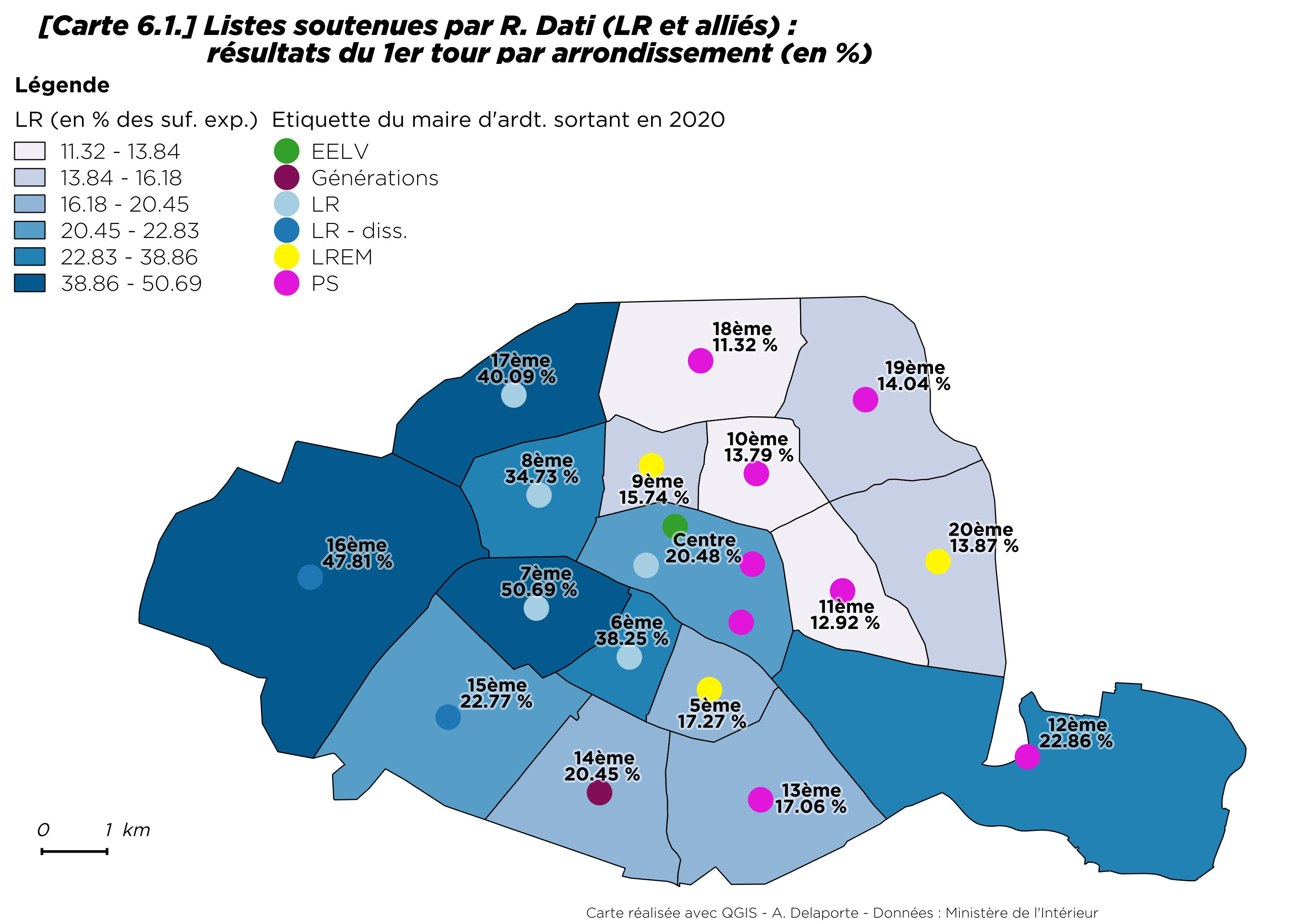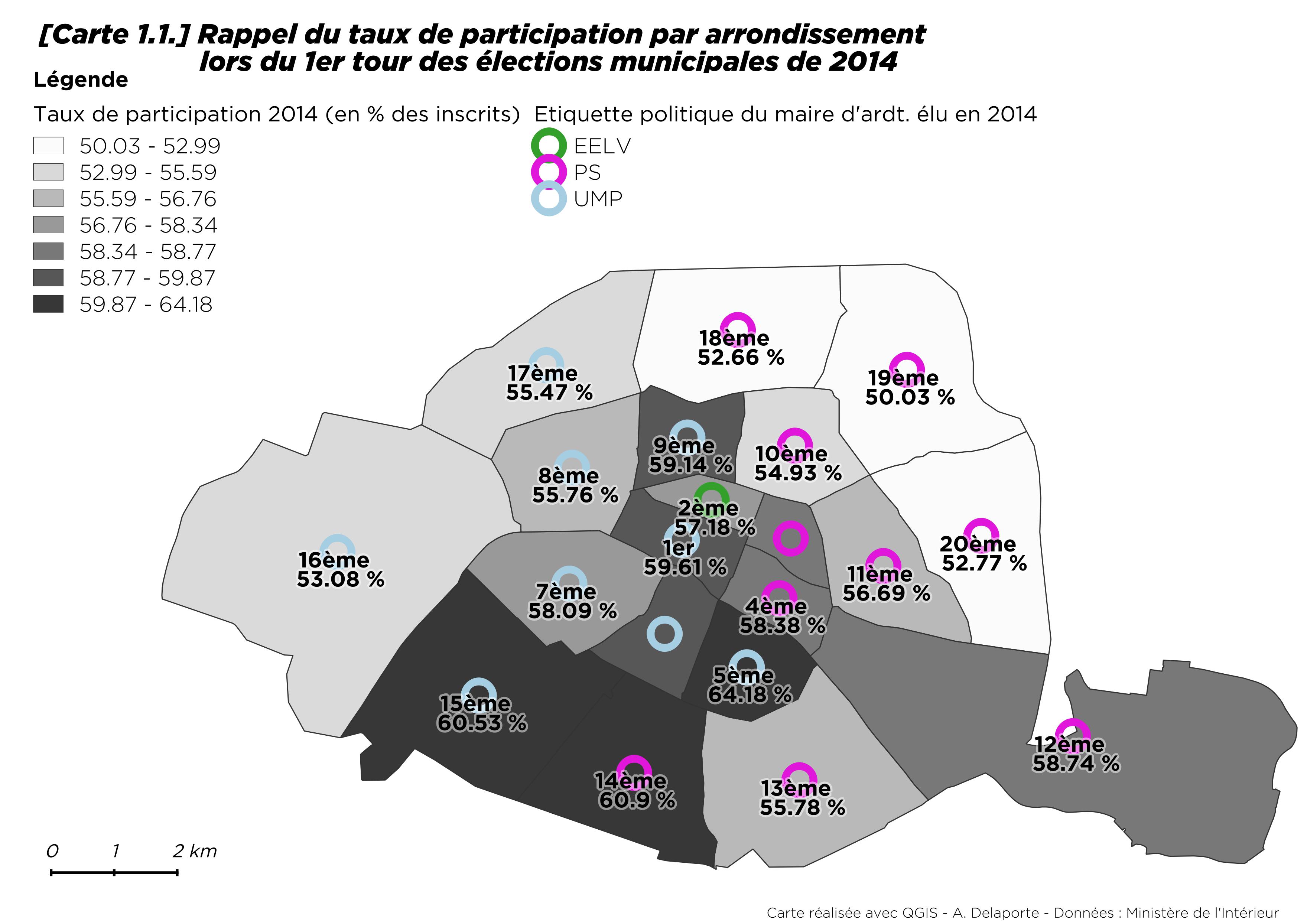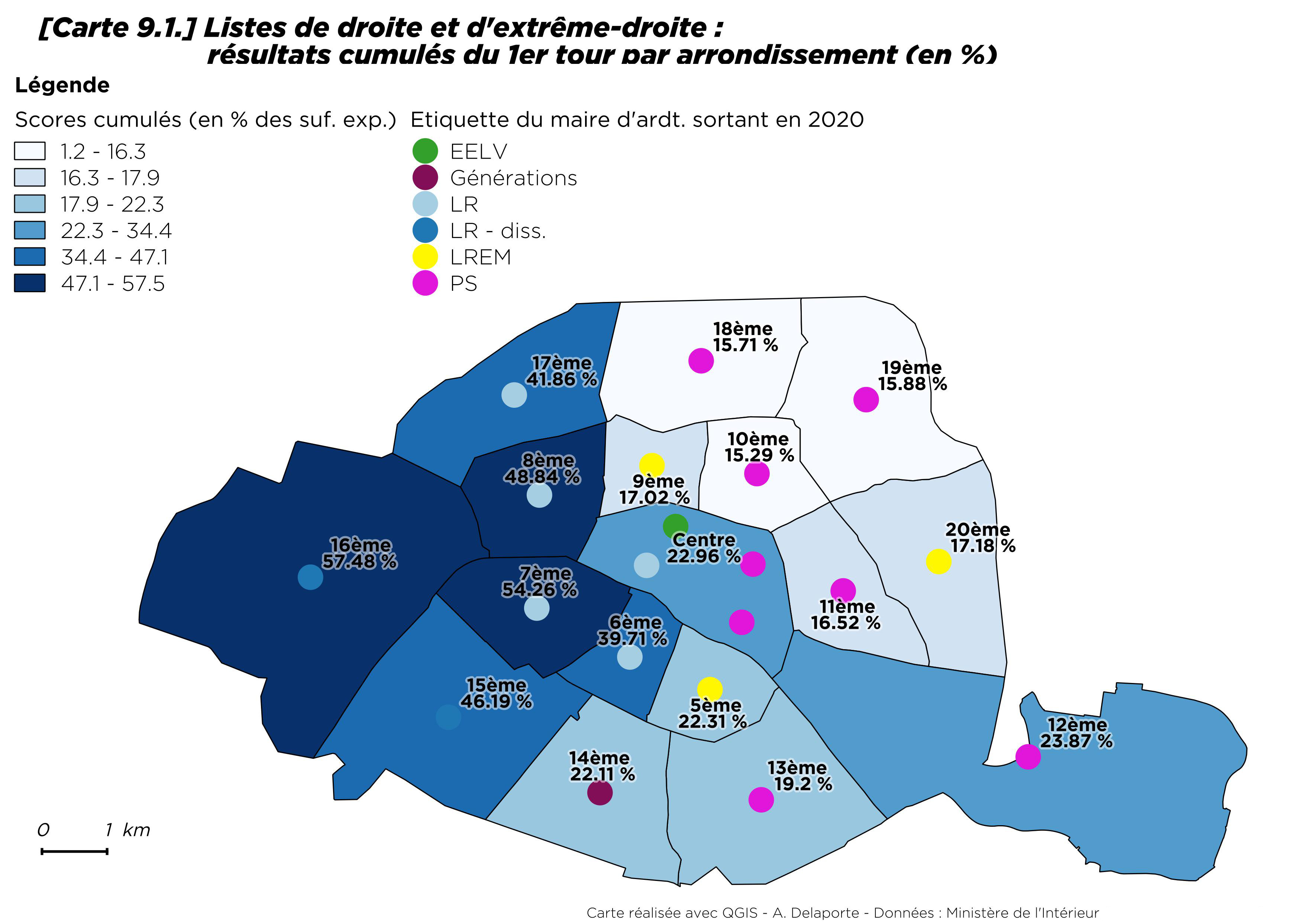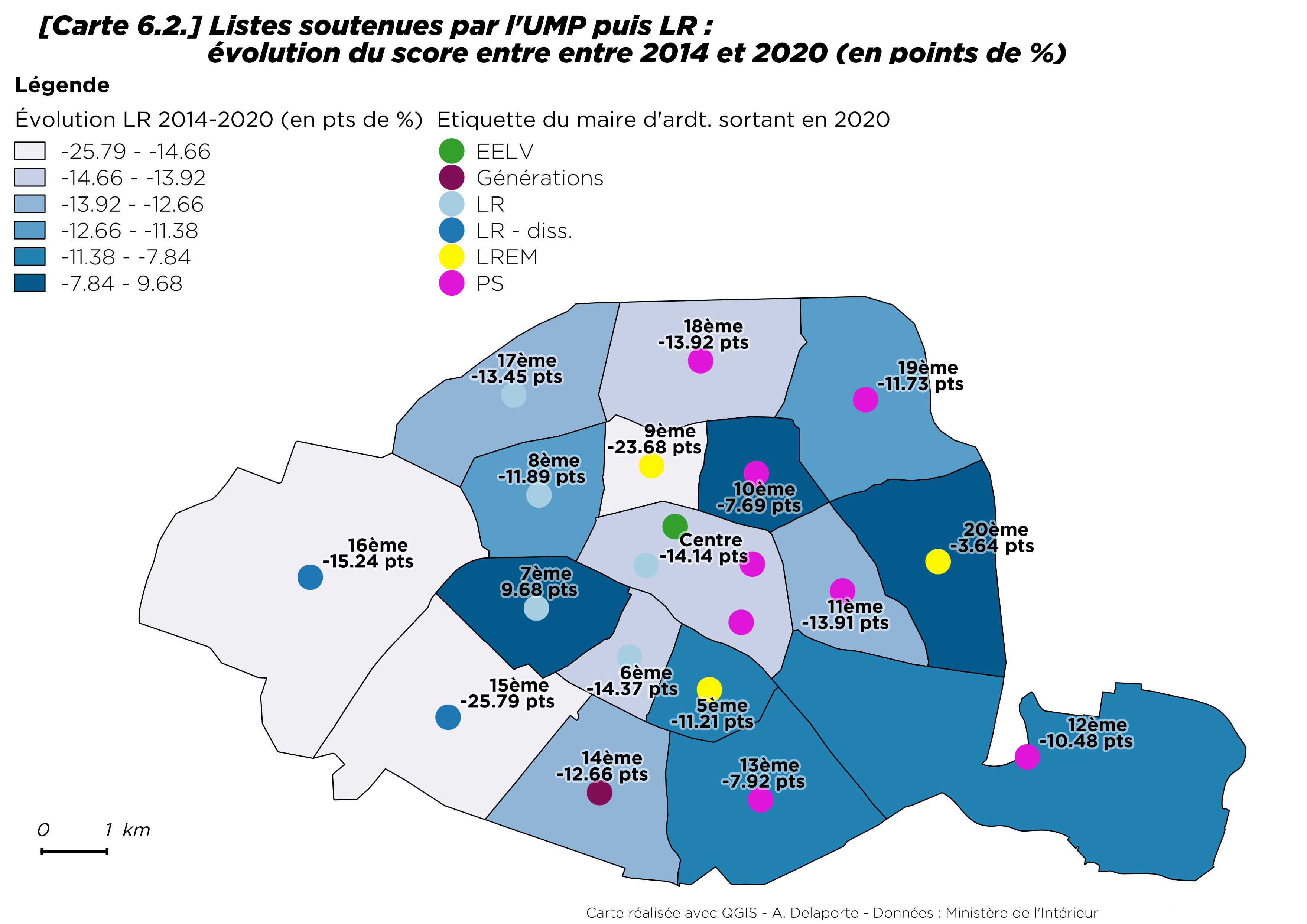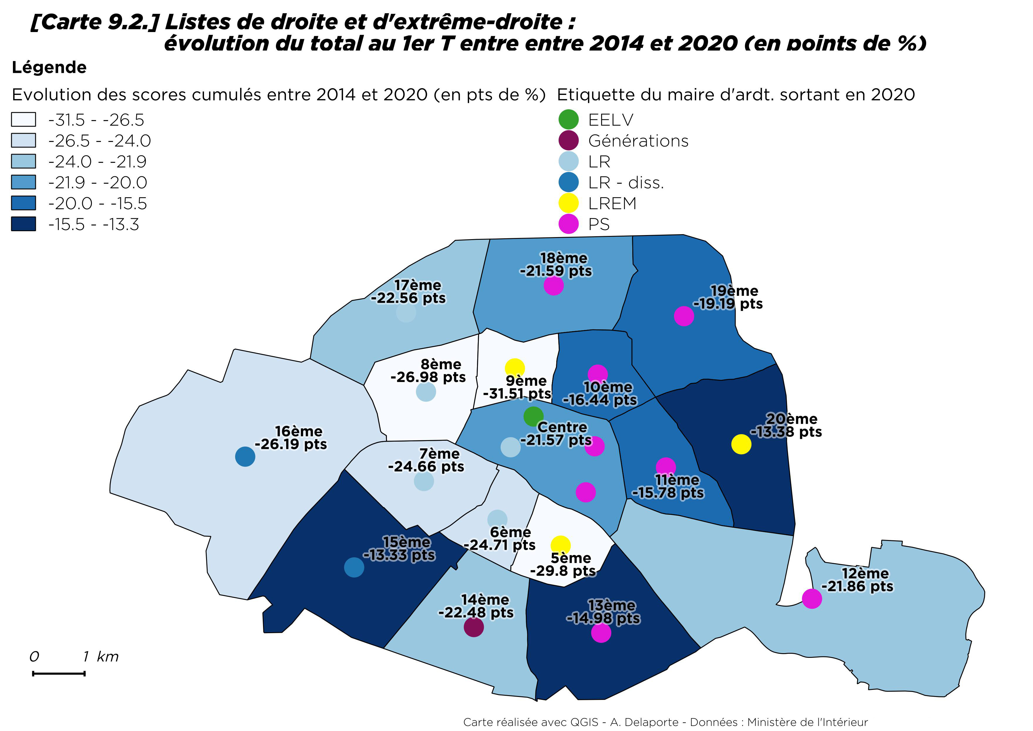 Par rapport à 2014, la progression du vote écologiste est néanmoins sensible, tout en restant modérée dans le 13e et le 20e arrondissement [8] où il progresse de moins d’un point. Le seul arrondissement où les écologistes reculent est Paris Centre (- 4,4 points). À Paris comme ailleurs, les maires ont souvent bénéficié de la prime au sortant.
