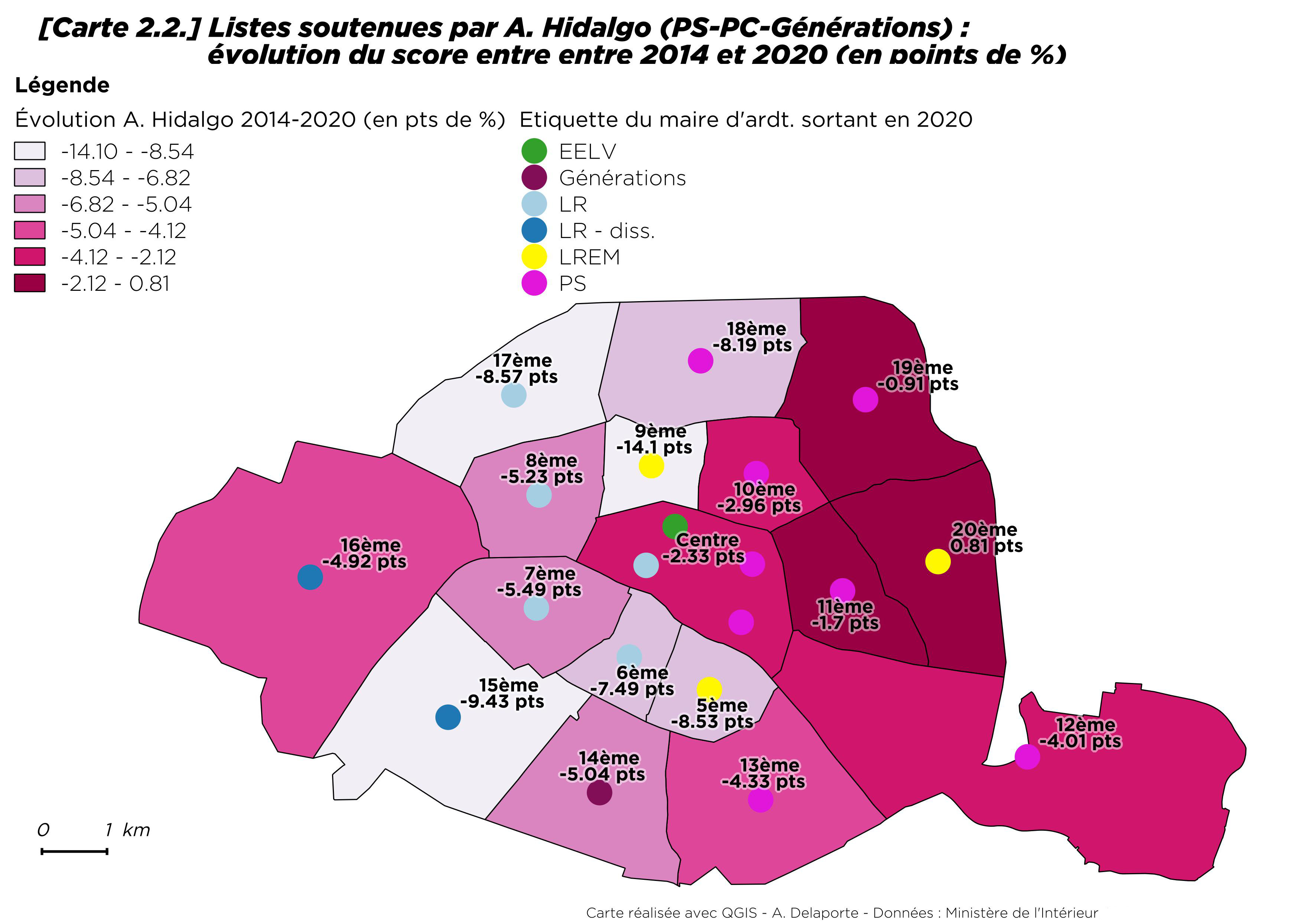 Les listes de la maire sortante sont néanmoins en recul d’environ 5 points dans l’ensemble de la ville. Elles enregistrent, par rapport à 2014, leur meilleure dynamique dans les arrondissements de l’est parisien (fig. 2.2). Dans le 19e, la liste ne fait ainsi qu’un point de moins qu’en 2014 et elle progresse même de près d’un point dans le 20e arrondissement, alors que la maire, élue en 2014 sous l’étiquette PS, avait rejoint LREM et se présentait contre la liste soutenue par Anne Hidalgo.