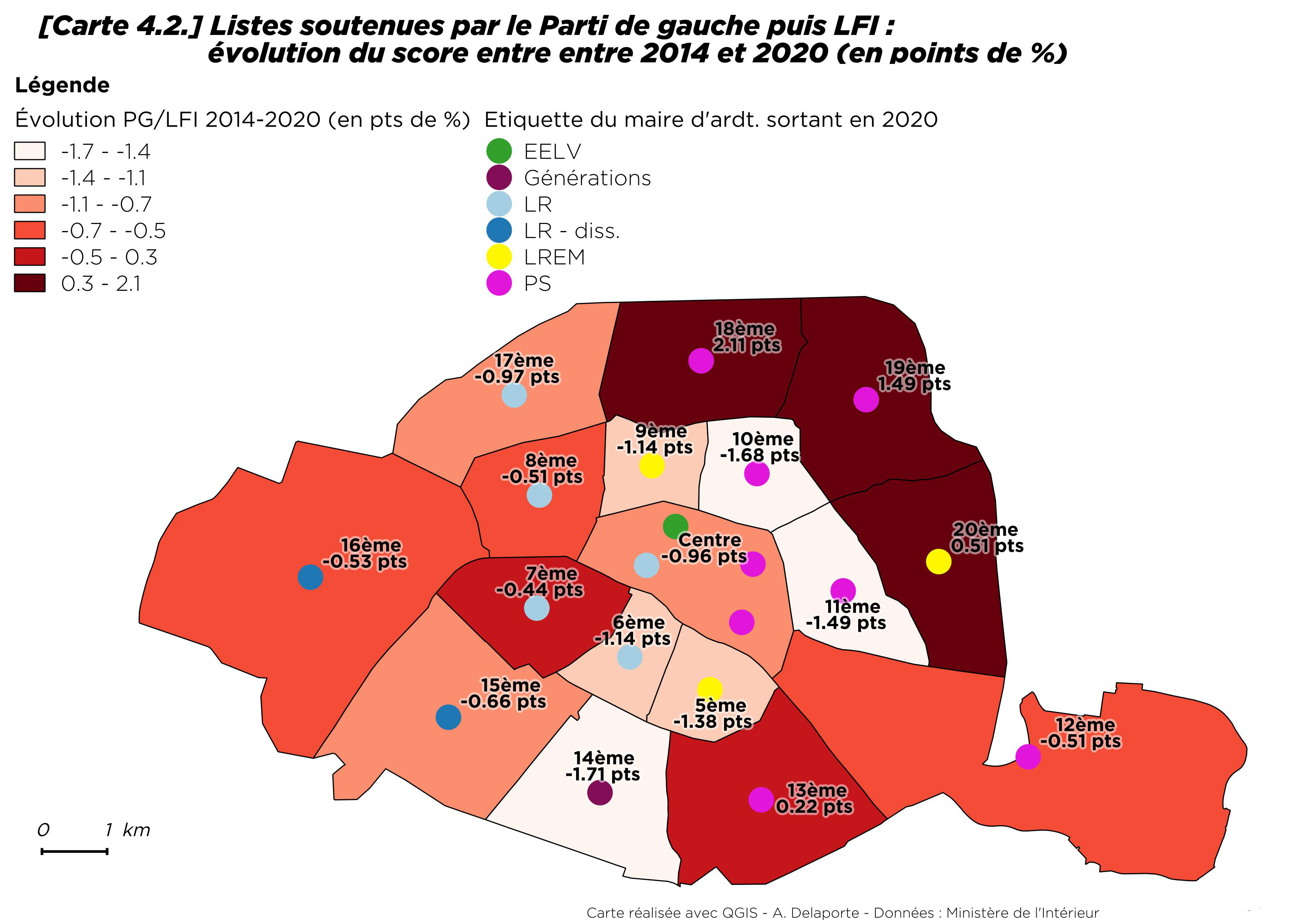 Le vote en faveur des listes soutenues par LFI est resté stable. Dans le 20e arrondissement, sa tête de liste, Danielle Simonnet, proche de Jean-Luc Mélenchon, qui était déjà cheffe de file parisienne en 2014 du Parti de gauche, a recueilli 10,8 % des voix. Cet arrondissement est le seul secteur où les listes « Décider Paris », soutenues par LFI, sont en capacité de se maintenir au second tour. Elles ne dépassent le seuil des 5 % (requis pour une fusion) que dans les 13e, 18e et 19e arrondissements. Partout ailleurs, les listes sont en recul par rapport à 2014, et de façon un peu plus prononcée dans les 10e et 11e arrondissements, où Anne Hidalgo réalise, elle, ses meilleurs résultats. Ce recul traduit également le changement de la sociologie de ces arrondissements qui ont connu une gentrification marquée ces deux dernières décennies (Clerval 2013).