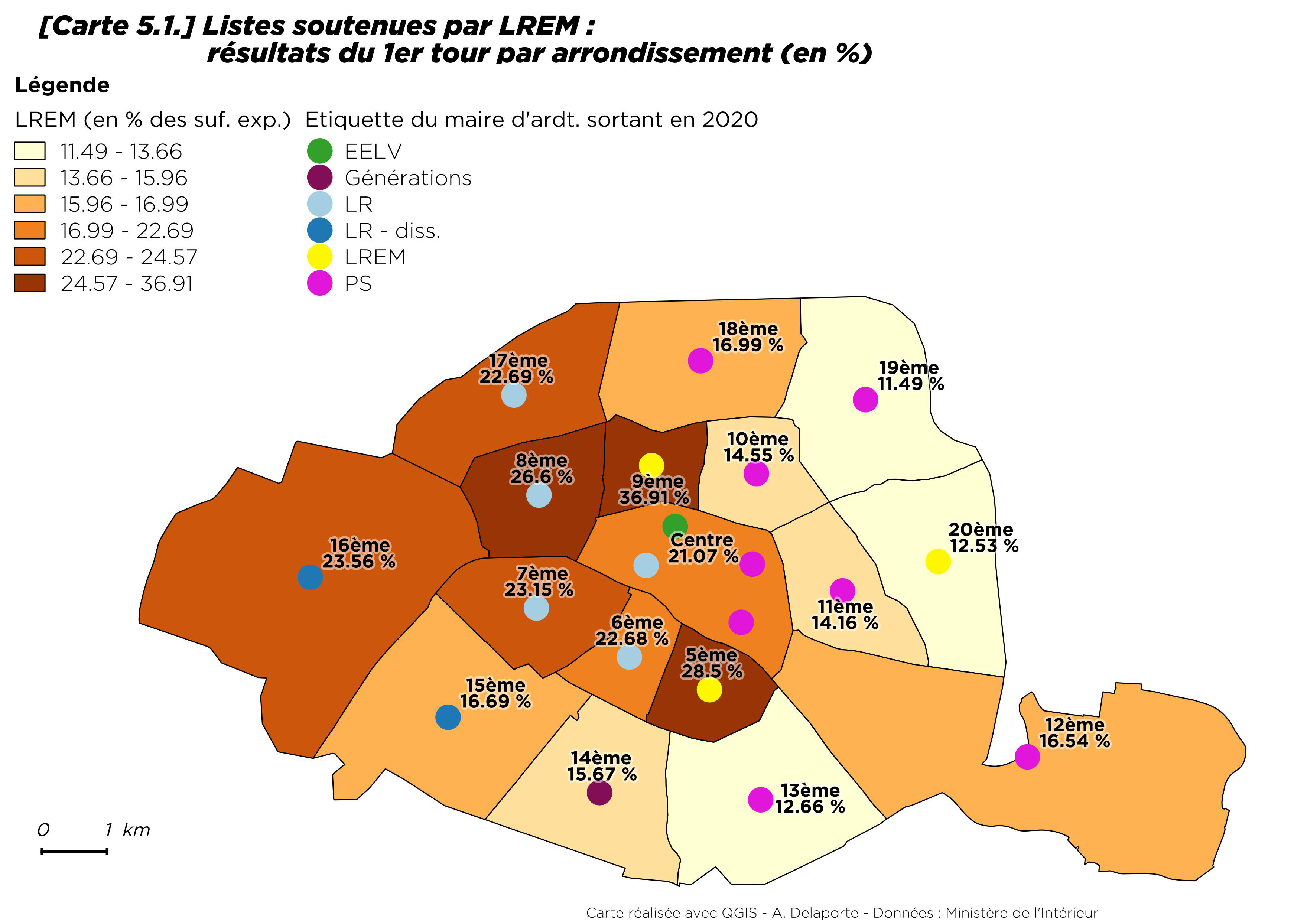 Alors que La République en marche avait initialement fait de Paris un de ses principaux enjeux de conquête, l’apparition de ce nouvel acteur partisan n’aura eu des effets qu’à la marge. Les seuls arrondissements où LREM est arrivée en tête le 15 mars sont ceux où des maires sortantes, élues sous l’étiquette Les Républicains en 2014, se présentaient en soutien à la candidature d’Agnès Buzyn. Hors de ces deux exceptions, les listes de Rachida Dati sont en tête dans les arrondissements de droite et celles d’Anne Hidalgo dans les arrondissements détenus par la gauche. Dans le nouveau secteur Paris Centre (fusion des 1er, 2e, 3e et 4e arrondissements), où LREM avait réalisé parmi ses meilleurs scores aux élections européennes [6], le scrutin donne une nette avance à la liste « Paris en commun », rassemblant notamment derrière Anne Hidalgo le Parti socialiste et le Parti communiste.
