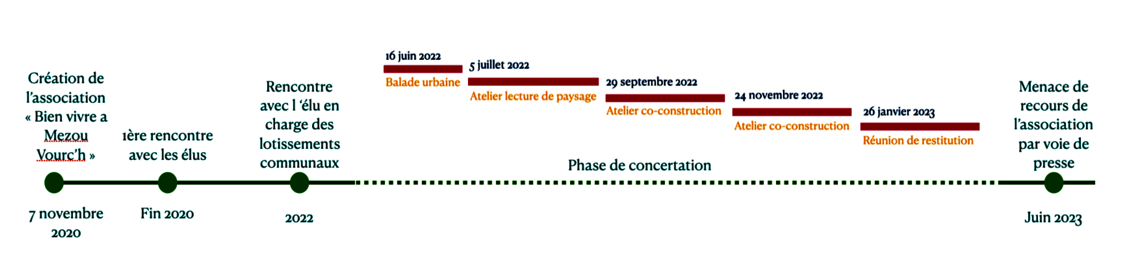 La contestation au projet de Mezou Vourc’h s’est constituée en juin 2022, quelques mois avant le lancement d’une étude pré-opérationnelle, qui incluait une première phase de concertation. En créant une association baptisée Bien vivre à Mezou Vourc’h [3], les opposants ont construit les conditions leur permettant de peser dans le débat. Ils se sont collectivement fait connaître auprès de la mairie au gré d’une rencontre avec les élus en charge du projet. Cela démontre leur rapidité de réaction pour s’organiser et s’informer, rapidité certainement caractéristique d’une interconnaissance forte au sein d’un petit groupe d’habitants [4]. C’est d’ailleurs celle-ci qui semble être privilégiée lors de la constitution de l’association, plutôt qu’une vision partagée des arguments à opposer au projet.