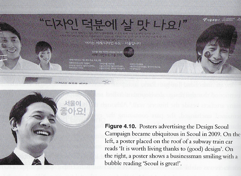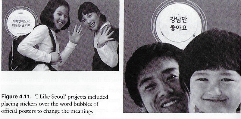 Fort de ces changements, le projet Design Seoul montre des partenariats public-privé qui peinent à se départir d’un développementalisme peu soucieux du maintien des bases productives d’un grand marché textile de l’Asie. Ici, l’auteure met à jour les risques d’échec que pourrait comporter une stratégie qui sous-estime le rôle joué par la diversité migratoire de Dongdaemun dans son succès économique, ce qu’illustre le taux de vacance commerciale dans certains shopping malls. Une tension majeure concerne la démolition en 2008 du stade de Dongdaemun (fig. 1), auquel les résidents sont attachés : après avoir été édifié pour célébrer le mariage de l’empereur Hirohito au début des années 1920, il accueillit des événements sportifs populaires et on y célébra la victoire de 1945, avant de servir de marché aux puces durant ses dernières années d’existence. En remplacement, le brandscape, conçu par Zaha Hadid (fig. 2), devait intégrer les découvertes issues de fouilles archéologiques, mais les commanditaires et le cabinet d’architecture n’ont pu s’entendre sur certains aspects fonctionnels, et l’histoire sportive populaire de ce stade n’a fait l’objet d’aucune politique d’archivage sérieuse. La campagne « Caring for citizens » louant les vertus de Design Seoul a quant à elle été détournée par des groupes d’artistes qualifiant leur action de guerilla design (p. 98-113, fig. 3 et 4) : sur les campagnes publicitaires étalant « jusqu’à la nausée » des citadins heureux et confiants dans la transformation de Séoul en capitale du design, ils superposent aux propos laudatifs (« J’adore Design Seoul ! ») des critiques sur la dureté des conditions de vie des classes populaires.
