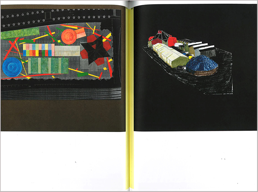 La grande diversité des documents graphiques laisse paraître les échelles traversées par les crayons de Patrick Bouchain : organigramme, coupe technique augmentée de pastel, dessin d’observation sur un coin, collage, herbier, citation, plan masse… En regardant certaines planches – celles sur fond noir représentant l’Académie Fratellini, construite en 2004 à Saint-Denis, par exemple, entre le feu du crayon de couleur et le collage de sources hétérogènes (figure 1) –, on pense au paysagiste Yves Brunier (1962-1991) qui a marqué de sa plastique et de son travail conceptuel de collage l’architecture et l’art du paysage dans les années 1990.