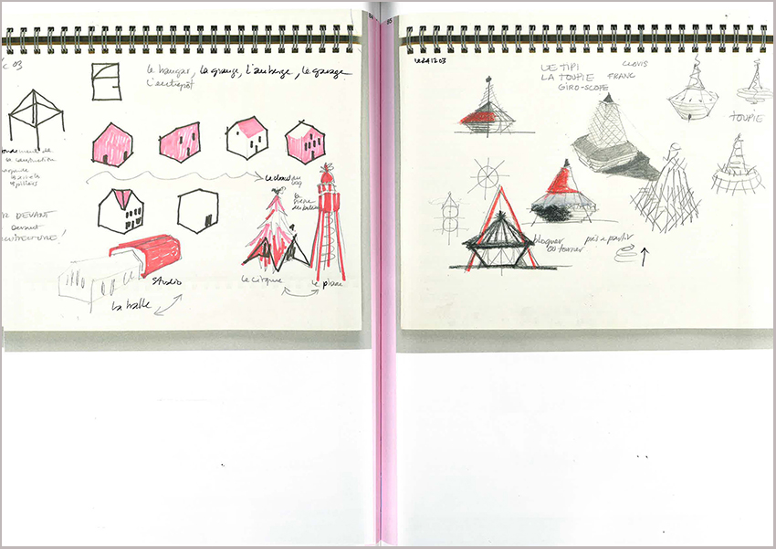 De quoi cette accumulation graphique ici reproduite est-elle la trace ? En traversant cinq décennies de pratique et une grande diversité de commandes, ces traces dessinent une œuvre – au-delà des aventures collectives – marquée fortement de l’esprit de son architecte. Il y a une cohérence sous-jacente à toutes ces esquisses, quelque chose de difficilement qualifiable, mais reconnaissable. Patrick Bouchain, architecte-conteur, architecte-bricoleur, possède un univers cohérent renforcé par la perpétuation sur l’ensemble d’une carrière des mêmes outils de travail.
