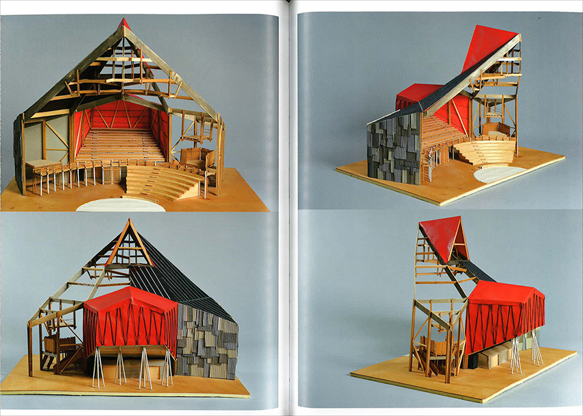 Ainsi commenté, chaque projet cherche un équilibre entre l’étrange et le familier. Les formes, toujours prises dans un élan, émergent de la synthèse de deux éléments : une attention à la contrainte technique, constructive (charpente, textile, fondement, tirant…) et un conte dont les architectures deviendront les décors. On pense aux nombreux projets de scènes de spectacle, comme le flamboyant Dragon volant vêtue de jaune et de noir à Rosny-sous-Bois – chapiteau qui héberge l’une des écoles nationales des arts du cirque. Les maquettes (par exemple figure 3) sont présentées par de précises photos du photographe François Lauginie, sous plusieurs angles et dans un livret à part des documents graphiques, comme une collection sur papier glacé, affirmant plus encore la grande autonomie de ce médium. Les maquettes sont révélatrices de l’attention portée à la structure, à la mise en œuvre ; elles sont pour la plupart très détaillées, souvent écorchées, révélant les différentes couches des bâtiments. Elles sont aussi augmentées d’une représentation fidèle des matériaux (brillance d’une toile, teinte d’une couverture, orientation d’un bardage). Les réductions conservent aussi les degrés de liberté nécessaires à la mise en œuvre finale ; si elles sont précises, elles ne sont pas pour autant figées. On décèle dans ces séries de photographies les capacités communicatives élargies au plus grand nombre de ces objets réduits.