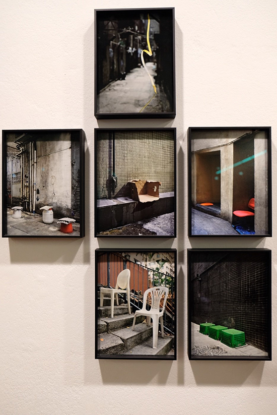 Nous avons détourné la hiérarchie du bâtiment, avec son escalier monumental qui mène aux salles d’exposition de l’étage, pour faire passer les visiteurs par l’escalier de service, puis par le couloir qui mène vers l’atelier, la cuisine et le stockage – couloir d’ordinaire inaccessible au public. Une série photographique de Zara Pfeiffer, qui documente ce travail des agents d’entretien, accompagne ce parcours inhabituel, suivi par la documentation du travail de réparation du bâtiment lui-même par Brenne. Par l’escalier de service, on entre d’une manière curieuse : directement dans la grande salle de l’exposition de 1000 m2. La première chose que l’on voit en entrant est l’étagère avec les produits que les agents d’entretien utilisent pour nettoyer quotidiennement la salle.