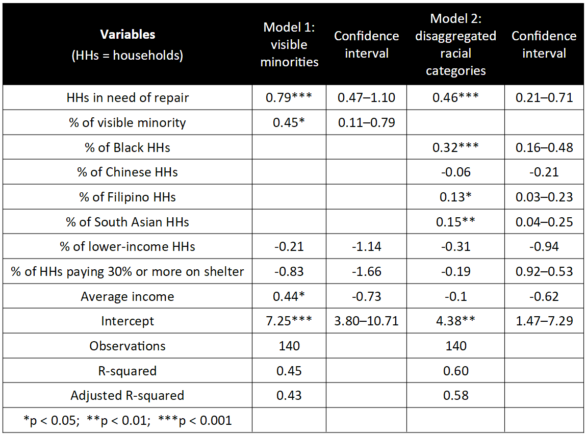 To illustrate the importance of racial identification, we compare the statistical significance of the “visible minority” classification versus more disaggregated racial identifiers. We focus on the relative composition of Black, Chinese, Filipino, and South Asian households, given their relative population size across the city. Table 1 provides the descriptive statistics for our analysis.