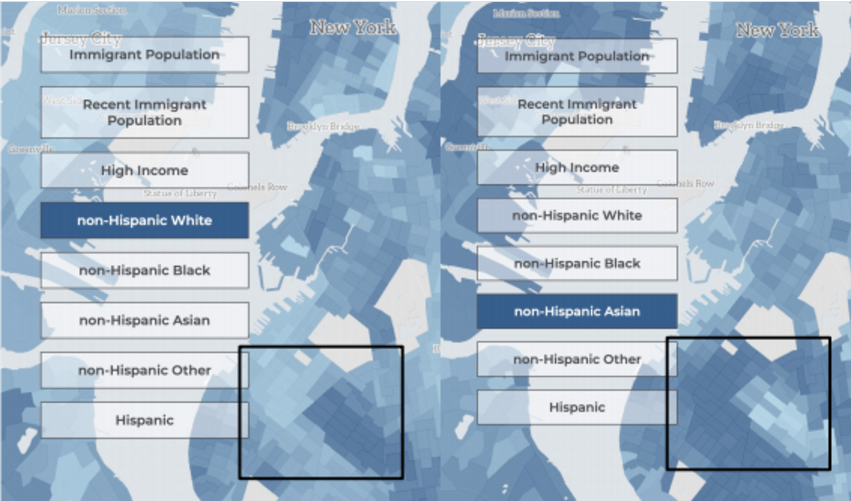 When we look at the single race choropleth maps, however, we see that these are actually two separate communities—Borough Park and Sunset Park—with large white and Asian communities, respectively.