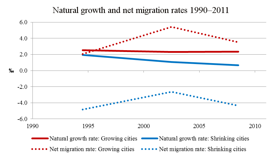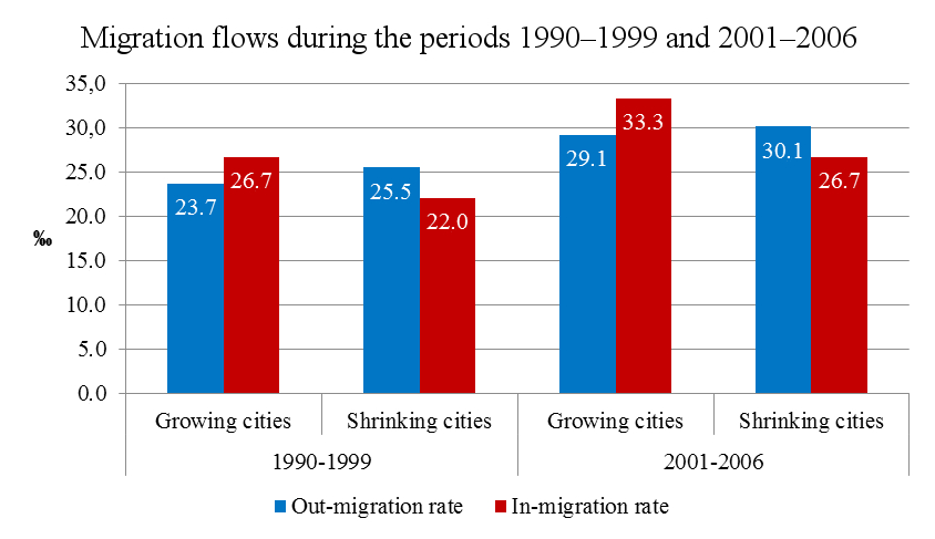When distinguishing out‑migration flows from in‑migration flows, the latter are not simply lower than the former in shrinking cities, but are also significantly lower than the equivalent values in growing cities : in‑migration rates in shrinking cities between 1990 and 1999 and between 2001 and 2006 were respectively 22‰ and 26.7‰, compared with 26.7‰ and 33.3‰ for growing cities (Figure 3). By contrast, out‑migration rates were similar in both types of cities. Shrinking cities therefore have not experienced mass departures, but rather have suffered from a lack of attractiveness resulting from a deficit of new residents.