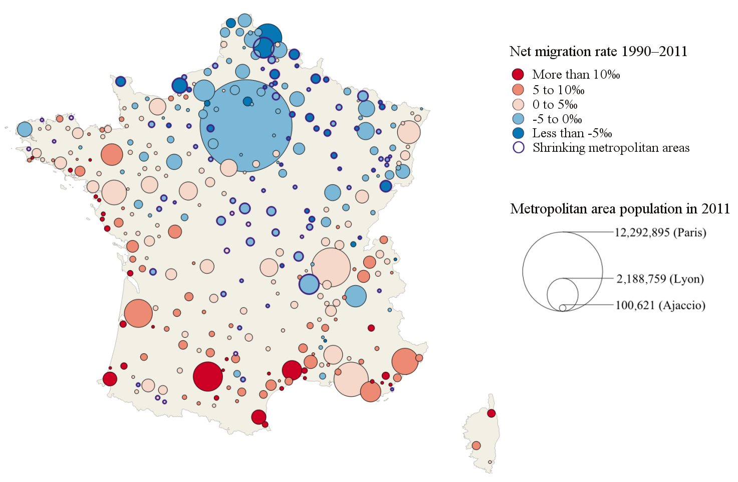 While the causes and expressions of urban decline can vary from one city to another, all shrinking cities share the same defining criterion, namely loss of population (Haase et al. 2016). This loss might be due to a relatively high number of deaths exceeding the number of births, or to the effects of migration, where the departures outnumber arrivals. In the case of France, the population loss in shrinking cities [1] results mostly from a migratory deficit (Rudolph 2015 ; Wolff et al. 2013). Net migration rates [2] in these cities are therefore negative, whereas in growing cities, the number of arrivals is greater than the number of departures. However, both growing and shrinking cities in France have positive natural growth rates, with a number of deaths lower than births. Relatively high levels of fertility in France (around two children per woman) explain this situation, resulting in a population that is increasing at the national level (Prioux 2007). The different demographic patterns between growing and shrinking cities can therefore largely be explained by the migratory factor, namely the ability of a city to hold on to inhabitants or attract new ones.