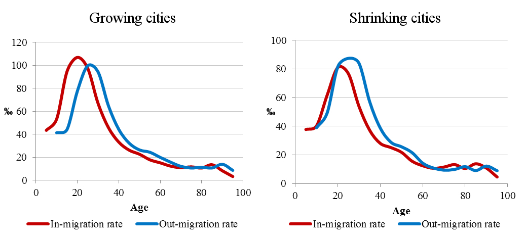 With regard to the age variable, out‑migration and in‑migration rates are highest for individuals aged 20 to 30. It is between these ages that the probability of residential mobility is the greatest, in growing and shrinking cities alike. However, there is a slight offset between the two rates : while mass in‑migration flows occur in urban areas around the age of 20, owing to residential mobility linked to higher education or employment strategies, the highest out‑migration rates are observed around age 30, as families (and thus households) grow, requires adjustments to housing conditions (Baccaïni 1994). While in growing cities in‑migration rates of young adults (aged 20–25) heavily exceed out‑migration rates and make up for the departures of 30-year-olds, out‑migration rates in shrinking cities are constantly higher than in‑migration rates, even at age 20. Inhabitants who leave shrinking cities are mostly aged 20 to 40, creating population deficits for this age group that contributes to the faster ageing process observed in these cities.