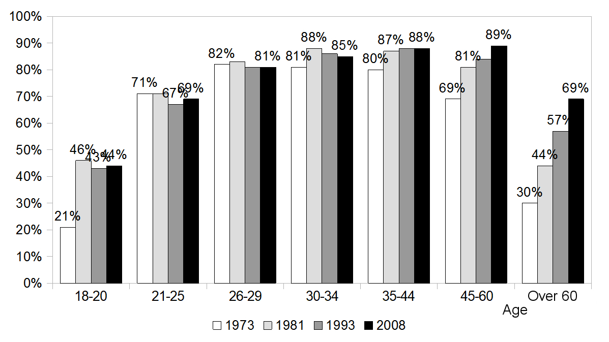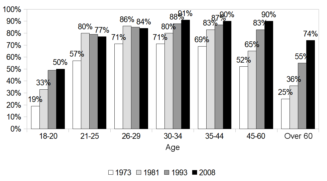 The rate of driver’s license ownership has increased very strongly among the youngest : while 18-20 year olds were 19% to hold pink paper in 1973, they were exactly 50% in 2008. During this period, we are therefore not witnessing a disaffection with the driver’s license, but on the contrary its massive diffusion among the youngest. The 1970s, during which the young cohorts of the baby boom massively drive (Demoli 2015a), saw a particularly high rise in the detention rate for this age group, while the other decades show a smaller growth trend.