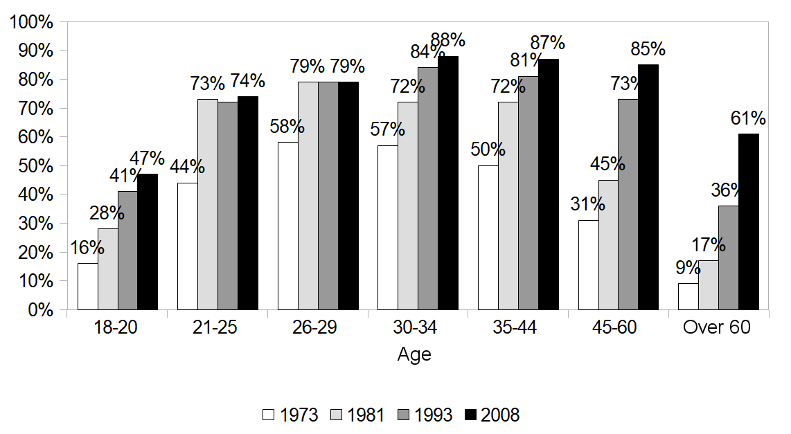 Interpretation : in 1973, 16 out of every 100 women aged 18 to 20 held a driver’s license.