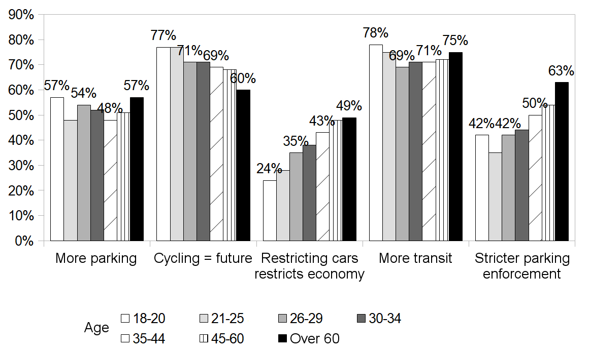 Interpretation : 57 out of 100 individuals aged 18 to 20 agreed with the statement "We need to keep building parking lots."