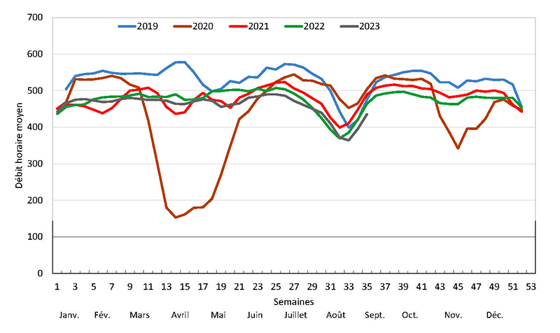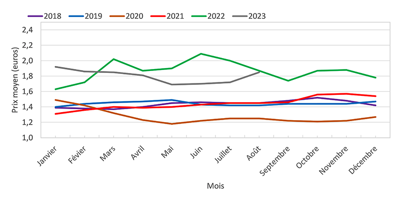 Après la reprise rapide du trafic automobile suite au premier confinement, les comptages mettent en évidence une baisse des flux automobiles en 2021, année encore très perturbée par la pandémie. Mais 2022 et 2023 se situent également à des niveaux inférieurs à 2019, mettant en évidence un tassement des trafics (figure 1). Se pose alors la question de l’évolution de la place de la voiture dans les mobilités urbaines. Ce tassement est vraisemblablement lié pour partie au niveau toujours élevé des pratiques de télétravail. Mais, à titre de comparaison, on observe, depuis 2021, une croissance soutenue des déplacements à vélo et, à partir de mi-2022, un retour aux niveaux d’usage des transports collectifs antérieurs à la crise sanitaire. À Lyon, comme dans de nombreuses agglomérations, la reconduction, voire l’accentuation, des politiques publiques en faveur des transports en commun, du vélo et de la maîtrise du trafic automobile conforte l’impression d’un retour aux tendances observées avant 2020. En effet, les politiques de réduction de la part des déplacements en voiture engagées depuis les années 2000 avaient déjà permis de réduire la part de la voiture de 52 % des déplacements des habitants de la métropole lyonnaise en 1995, à 47 % en 2006 puis à 42 % en 2015 (Sytral 2007 ; Sytral 2016). Mais le contexte de la mobilité s’est aussi transformé, avec, outre la large diffusion du télétravail, une hausse notable des prix des carburants depuis 2022 (figure 4). Ces éléments de coût contribuent également à l’explication de ce tassement.