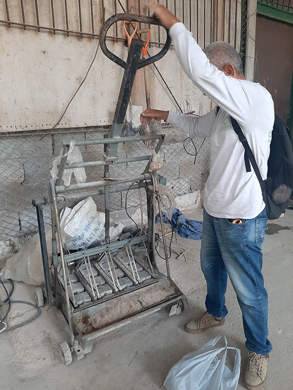 Les pénuries de matériaux de construction et des objets de maintenance des logements ajoutent à cette crise de la redistribution une dimension matérielle. Le parc de logements se précarise à mesure que la crise affecte le pays. Ces pénuries s’expliquent à la fois par les sanctions étasuniennes, qui empêchent toujours l’importation de nombreux biens de consommations, et par les fragilités de l’économie cubaine à une échelle macroéconomique. Le ciment, rare et onéreux, est par exemple au cœur d’un vaste marché noir. Les habitant·es inventent des matériaux de récupération avec plus ou moins de succès. La figure 4 montre une ponedora, petite machine qui fabrique des parpaings (bloques) à partir de gravats d’un immeuble en ruine.