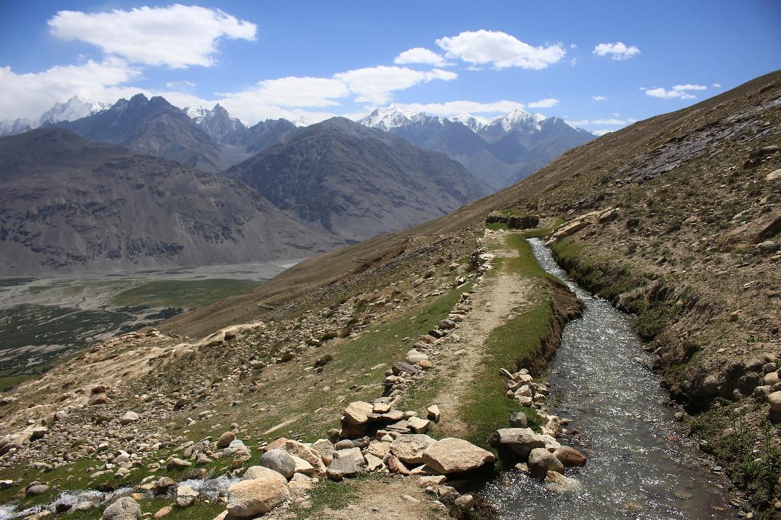 Au bord de la Wakhan, des villages se sont établis il y a plusieurs centaines d’années sur les cônes de déjection d’affluents des montagnes du Pamir, afin de se protéger des crues. Dans cette région aride, à la frontière entre le Tadjikistan et l’Afghanistan, il a fallu faire preuve d’ingéniosité pour distribuer une eau disponible très localement à une plus large échelle, sans risquer l’inondation. L’installation des populations a été accompagnée par la construction d’un système ancestral de distribution d’eau, partant des affluents de montagnes et parcourant plusieurs dizaines de kilomètres pour alimenter les villages voisins dépourvus d’eau et irriguer chaque parcelle agricole. Ce système consiste en un canal principal creusé à flanc de montagne, consolidé par de la végétation et des pierres.