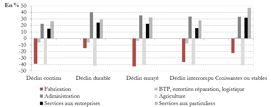 Toutefois, malgré cette perte de vitesse du secteur industriel, la part des emplois de fabrication y reste encore supérieure à celle observée dans les aires urbaines en croissance. Là où le déclin est enrayé, par exemple, malgré une baisse de 43 % des emplois de fabrication entre 1990 et 2011, le secteur industriel pèse encore deux fois plus lourd que dans les aires urbaines qui gagnent de la population (16,5 % contre 8,1 %). Les emplois des secteurs du bâtiment et des travaux publics (BTP), du transport, de la logistique, de l’entretien–réparation et de l’agriculture sont également surreprésentés, alors que les secteurs de la distribution et des services sont moins dynamiques. Ainsi, les aires urbaines en décroissance se caractérisent par la faiblesse de leur économie présentielle – qui regroupe des activités telles que les services domestiques ou le commerce de détail ayant vocation à répondre à la demande locale (Davezies 2009 ; Talandier 2013) [7] –, qui s’explique, entre autres, par une plus grande difficulté à attirer ceux qui sont considérés comme les moteurs de cette économie : touristes, retraités ou encore étudiants.