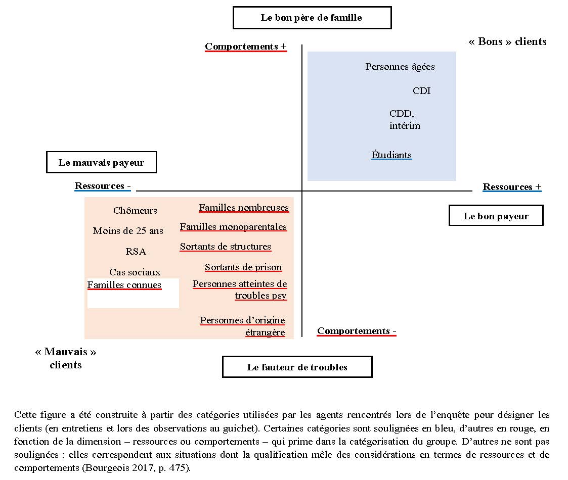 Cette position de gestionnaire de risques a deux implications majeures pour les chargés d’attribution. D’une part, elle les conduit à formuler des jugements sur les demandeurs de logement du point de vue des risques qu’ils représentent pour le bailleur. Réalisé à partir des informations contenues dans les dossiers et des indices recueillis lors des entretiens en face-à-face, le travail de catégorisation des ménages se structure autour de deux axes principaux – les ressources et les comportements – qui font émerger quatre figures de clients : le « fauteur de troubles » versus le « bon père de famille », le « mauvais payeur » versus le « bon payeur » (figure 4). Elle dessine ainsi un continuum de risques.