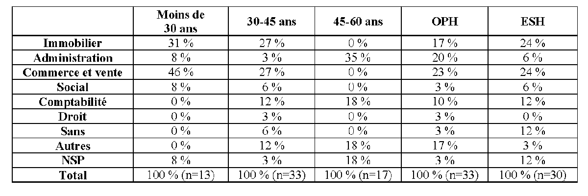 Les bailleurs sociaux n’ont pas échappé à la « modernisation » des administrations publiques, qui s’est déployée à partir des années 1980 (Avril, Cartier et Siblot 2005 ; Bezes 2009). Les réformes managériales y prennent des formes plurielles. Tout d’abord, les modes de recrutement et de formation des agents ont évolué vers une approche plus commerciale du métier. Parmi l’ensemble de nos enquêtés, les nouvelles recrues sont en moyenne plus diplômées que leurs aînés : la totalité des moins de 30 ans a fait des études supérieures (BTS, licence et master), contre 76 % des 30-45 ans et 6 % des 45-60 ans (figure 1). Elles sont aussi plus souvent spécialistes de l’immobilier : 77 % des moins de 30 ans ont suivi une formation dans les domaines de l’immobilier, de la vente et du commerce, contre 54 % seulement des 30-45 ans et aucun parmi les 45-60 ans (figure 2). Dotée d’un BEP ou d’un CAP, les agents les plus expérimentés sont, au contraire, majoritairement entrés dans le logement social par hasard.