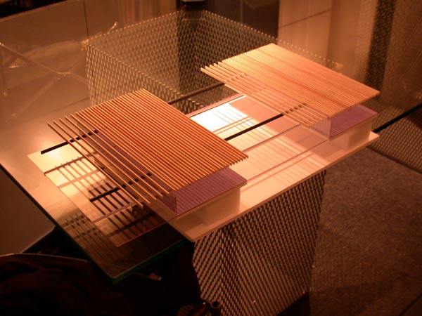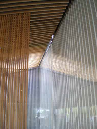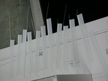 Comme un organisme effectivement, l’architecture de Kuma évolue vite, se régénère, se transmute, en expérimentant continuellement de nouvelles matières, de nouveaux procédés, de nouveaux motifs, etc. Des persiennes de bois qui signaient son œuvre il y a quelques années, nous sommes aujourd’hui face à des motifs multipliés, proliférants, pour dire le petit, l’organique, pour « briser la masse ». De nouveaux projets (Granada Performing Arts Center, SX Project...) montrent le travail autour de cellules, le modèle des nids d’abeilles, ou des plis (Asakusa Tourist Information Center). Dans une autre pièce sont exposées deux très grandes maquettes : celle du projet du FRAC de Besançon avec sa toiture pixellisée ; celle de l’opéra en Chine, avec ses alvéoles. Des persiennes, un peu, encore. Oribe Tea Room : « paper snake », un serpent en origami, avec ses pliures. Pour le TCP Project, la maquette montre une expérimentation autour de fils de coton et propose des formes de tissage. Makeru kenchiku, « architecture dominée », ou vaincue, plutôt qu’architecture dominante. Pour l’ami japonais qui m’accompagne lors de cette visite (il s’agit de Chihiro Minato, artiste et anthropologue, avec qui je signe la monographie sur Kuma), c’est cette proposition qui est proprement révolutionnaire, l’idée d’une architecture qui adviendrait de manière circonstancielle, quasiment hasardeuse, dans la rencontre, qui deviendrait au sens de Gilles Deleuze, suivant son propre chemin et sans qu’une voix d’autorité (comme celle de l’architecte) puisse rendre compte à elle seule de ce qui s’est produit.