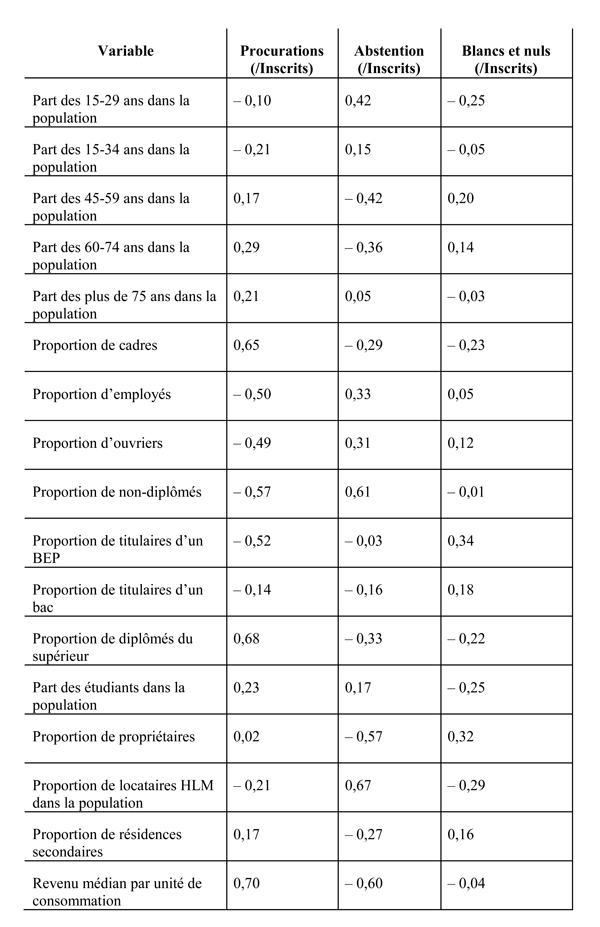 Le coefficient de corrélation de Pearson (appelé r) varie entre – 1 et + 1. Le signe de la corrélation (+ ou –) indique le sens de la relation statistique linéaire. Un signe positif indique que les deux variables varient de concert : une hausse de la procuration est associée à une hausse de la proportion de cadres. Un signe négatif indique que la variation se fait en sens inverse, une hausse de la proportion de non-diplômés est associée à une baisse de la proportion de votes par procuration. Plus la valeur est proche de 1 (ou de –1), plus la relation entre le vote par procuration et la variable étudiée est intense. Quand le coefficient se rapproche de zéro, la relation est inexistante.