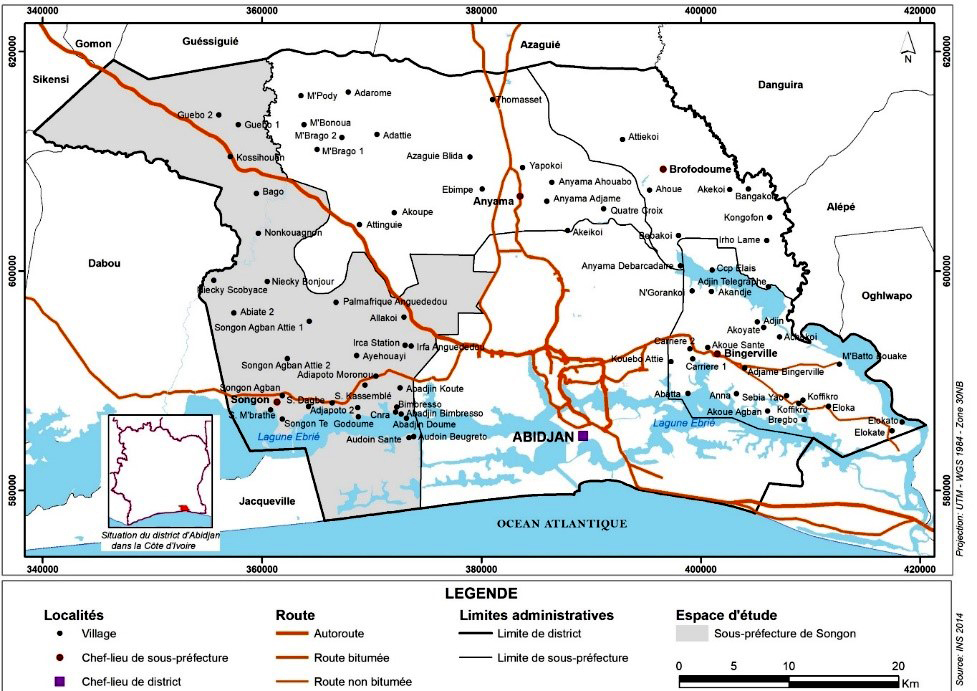 Songon Subprefecture is located to the west of the Abidjan metropolitan area, 23 km (14 miles) from Abidjan’s central business district (Le Plateau), and covers an area of 621.71 km² (240.04 sq. mi.) (Figure 1).